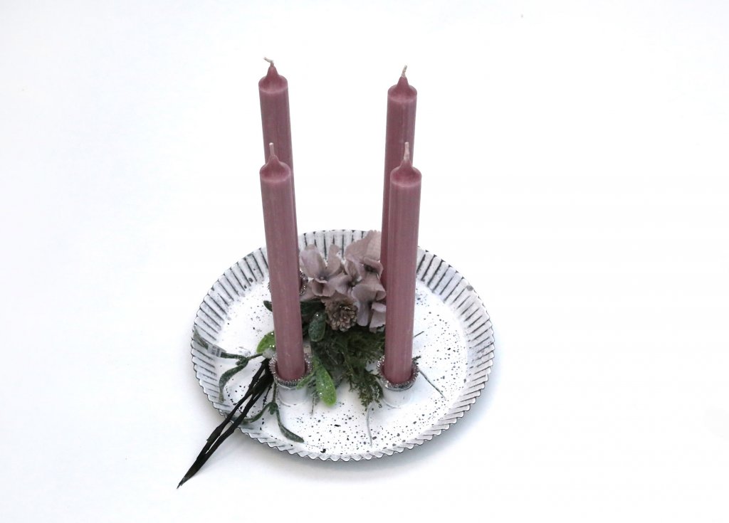 Aðventukrans á hvítum rustik bakka með fjórum bleikum kertum og skrauti í stíl.