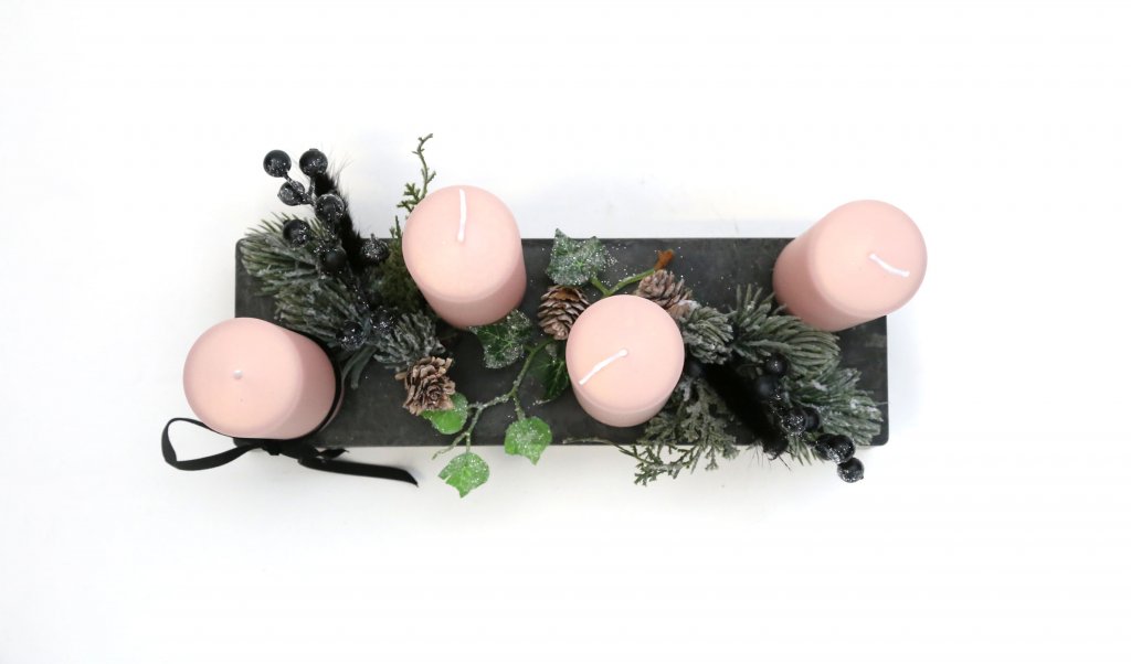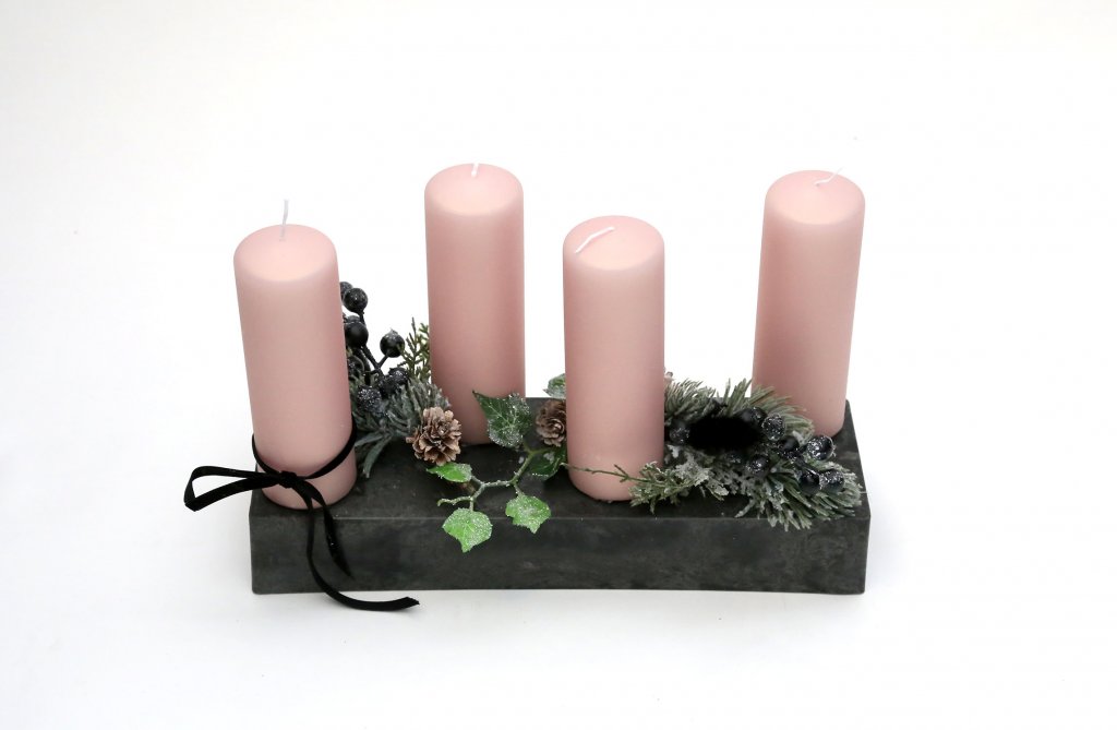 Aðventukrans á gráum kubb með fjórum bleikum kubbakertum og skrauti í stíl.