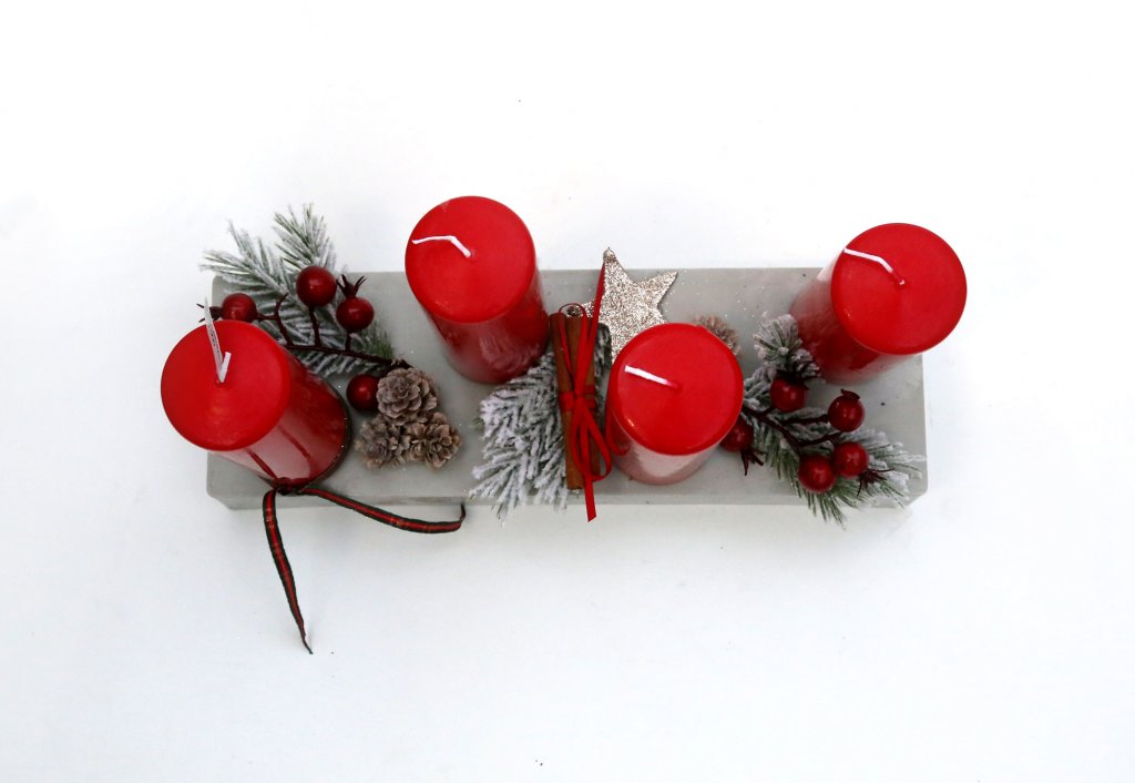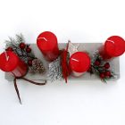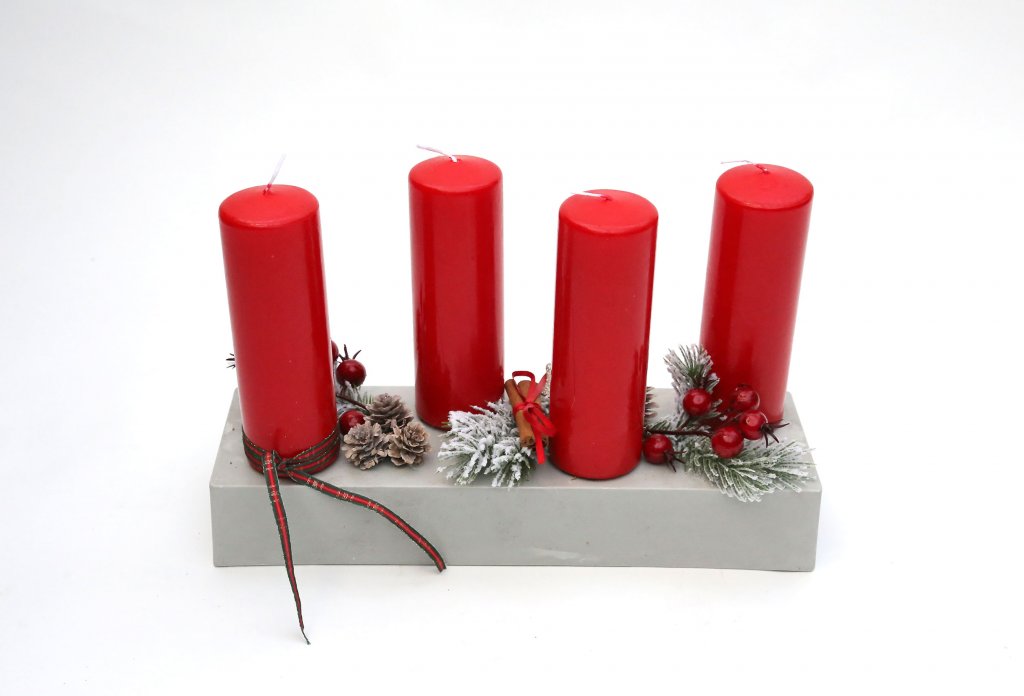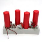 Aðventukrans á gráum kubb með fjórum rauðum kubbakertum og skrauti í stíl.