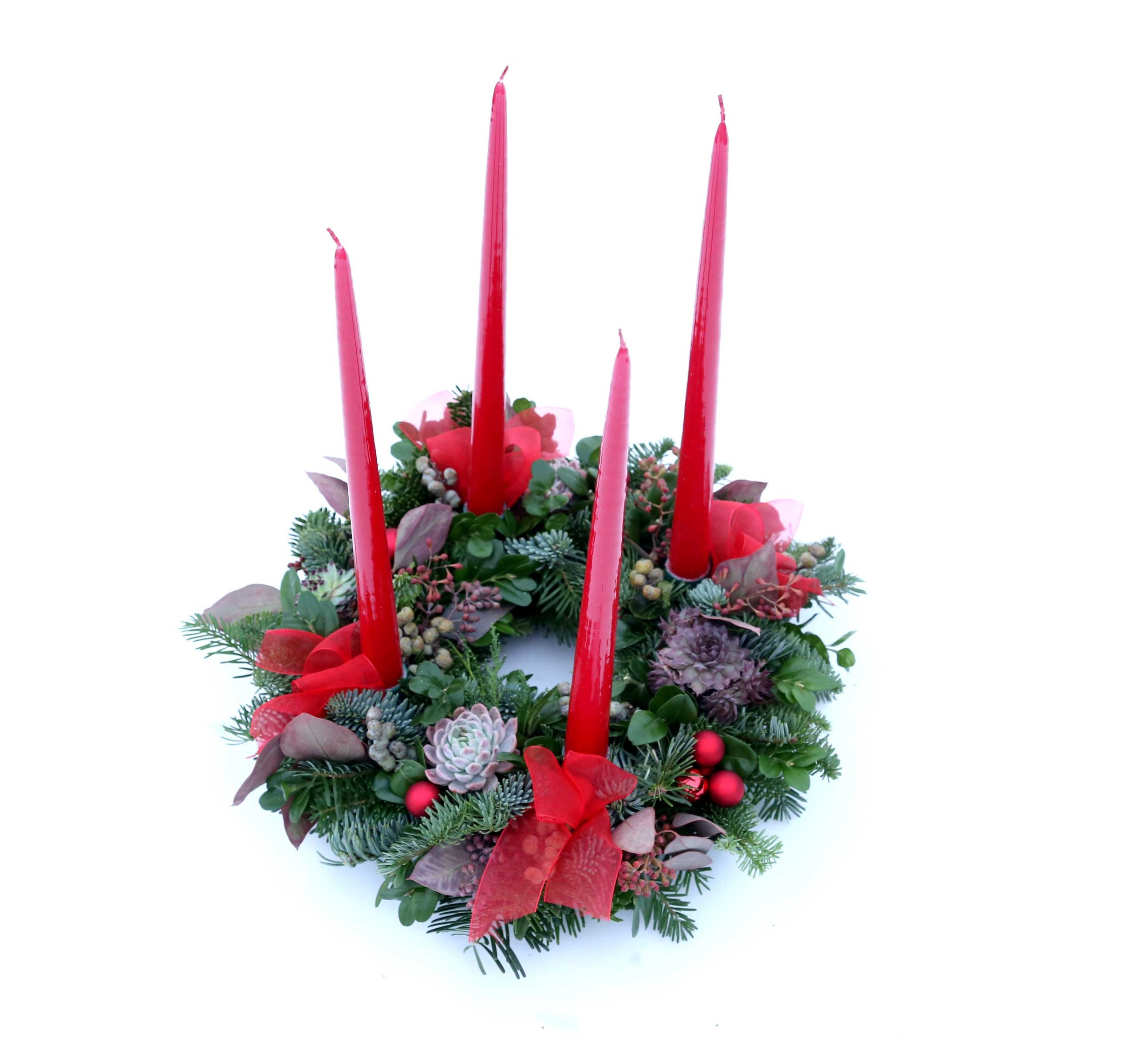 Klasskískur, vafinn, aðventukrans með fallegum rauðum kertum.