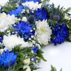 Fallega skreytt akkeri með bláum og hvítum krysa, alpaþyrni, brúðarslöri og blöndu af grænu.