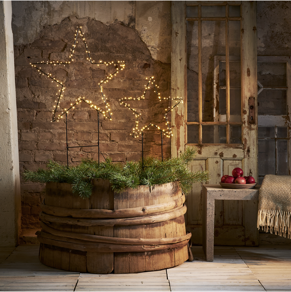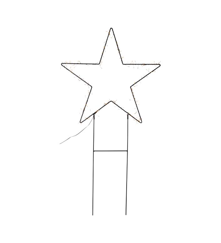 Falleg útiljósastjarna í svörtum lit með hvít LED ljós (warm white). Stjarnan stendur á tveimur pinnum sem hægt er að stinga í pott eða í jörðu.