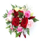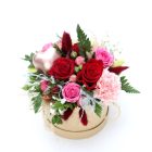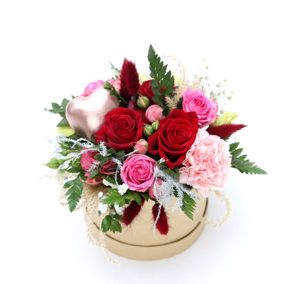 Ljúf og falleg skreyting í öskju sem inniheldur rauðar og bleikar rósir, nellikku, strá, silkivönd, aspas, skrauthjarta og blöndu af grænu.