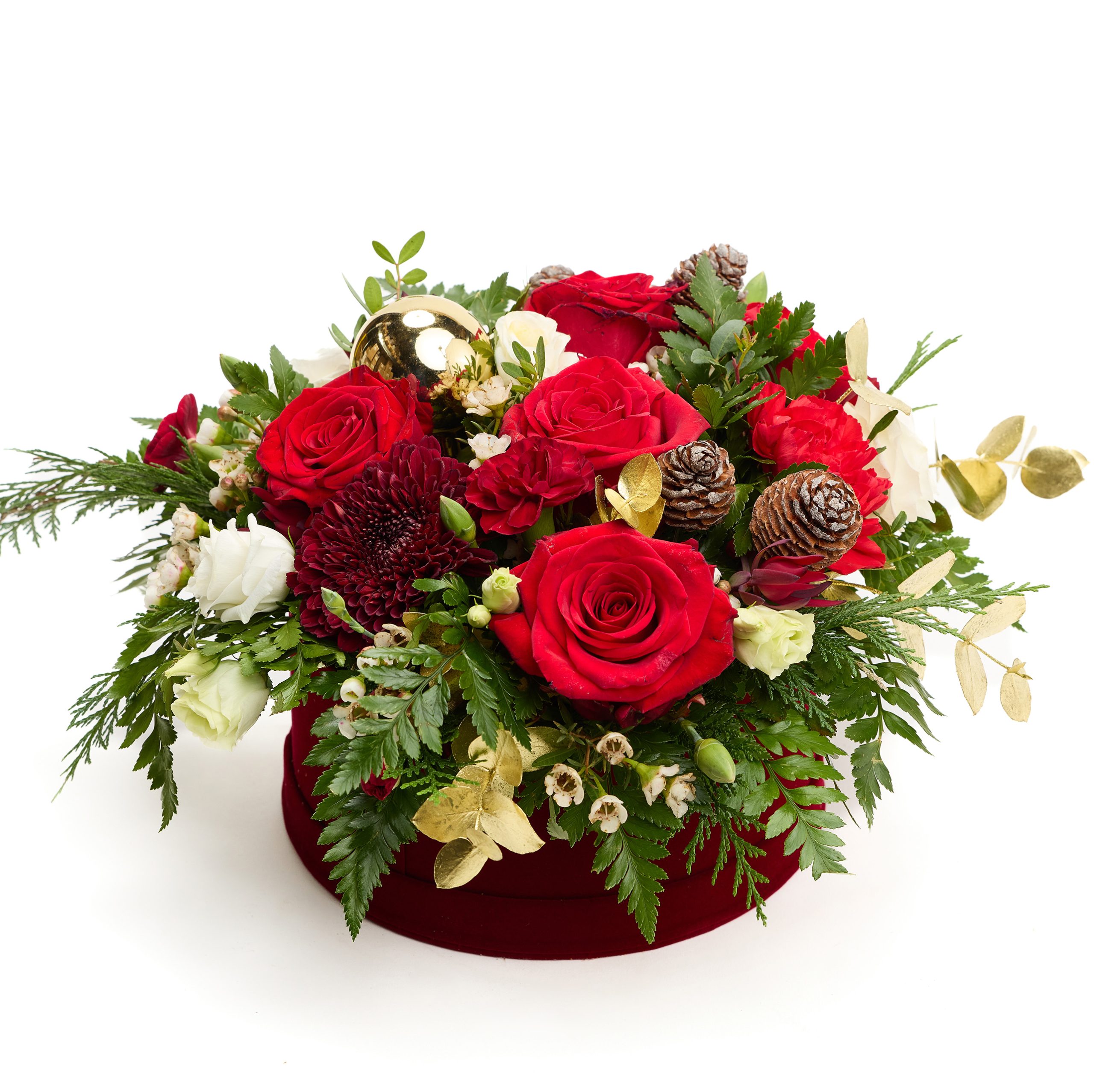Blómaskreyting í öskju með jólalegu ívafi. Rósir, krysi, könglar, gylltar greinar og bland af grænu.