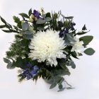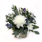 Glæsilegur vöndur með stórum hvítum krysa, alpaþyrni, silkivendi og blöndu af grænu.