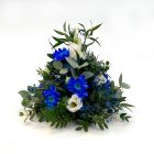 Falleg borðskreyting sem er um 25 cm há með kyrsa, silkivendi og blöndu af grænu.