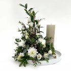 Glæsileg borðskreyting, 40 cm há. Skreytingin samanstendur af kyrsa, silkivendi, brúðarslöri og blöndu af grænu.