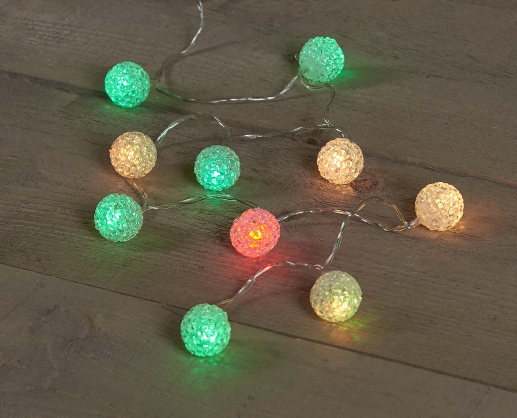Kúlusería með 10 LED marglitum ljósum á silfur snúru. Serían gengur fyrir batteríum.