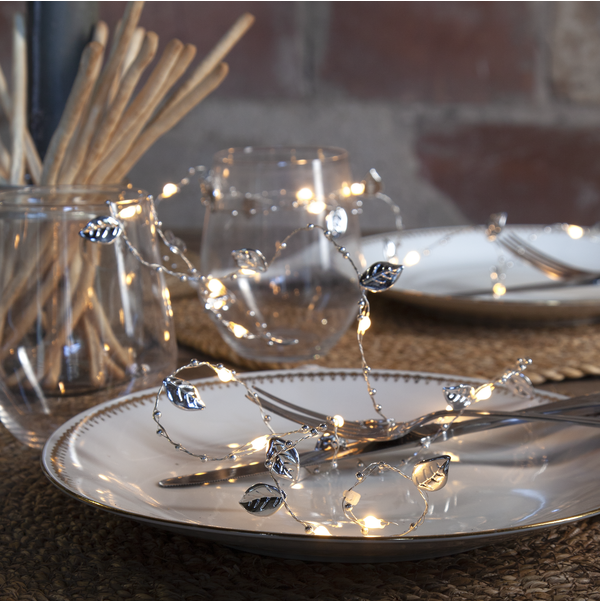 Falleg silfurlituð sería með laufum, 20 LED ljós á silfur vír. Serían gengur fyrir batteríum. Tímastillir sem gefur möguleika á að hafa kveikt í 6 klst og slökkt í 18 klst.