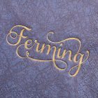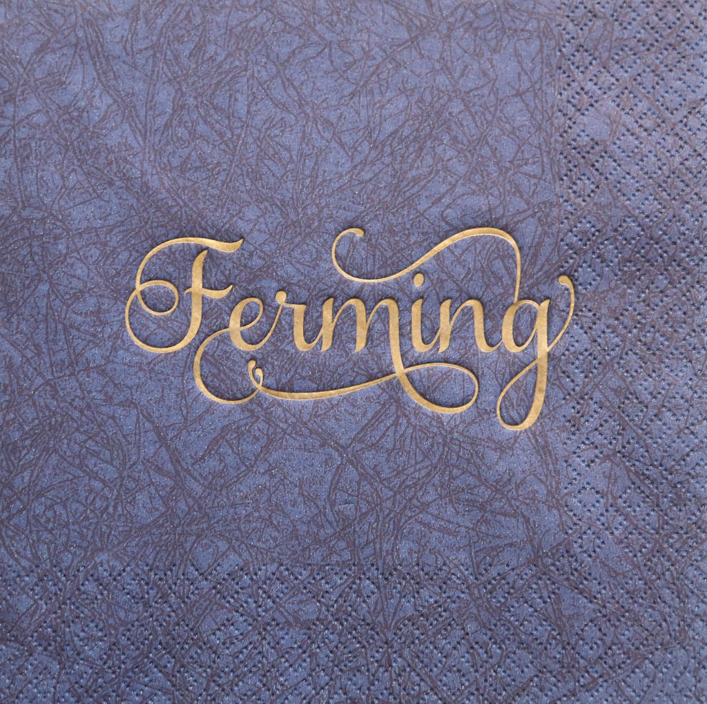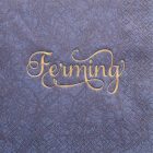 Sléttar dökkbláar servíettur frá Home fashion með skrautskrifað í gylltu ,,Ferming“ á hverja servíettu.