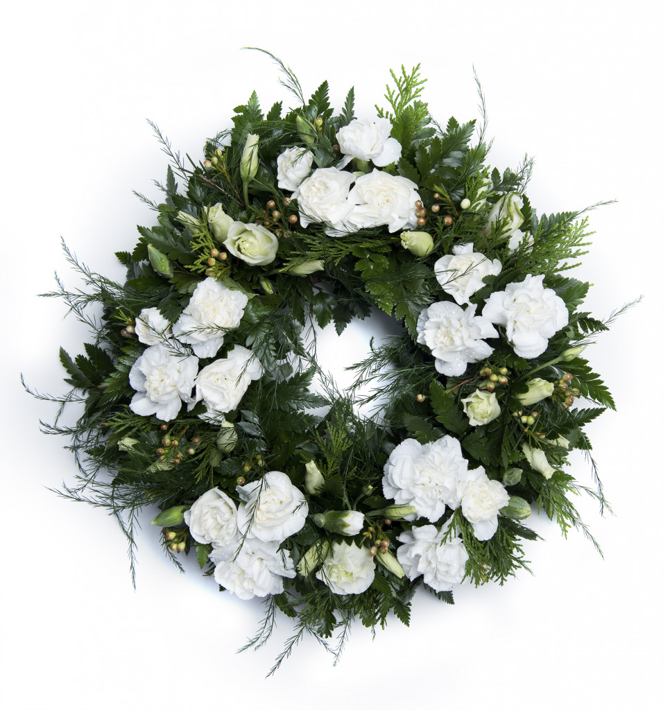 Ljúfur lítill krans með nellikum, silkivendi og blöndu af grænu.