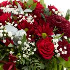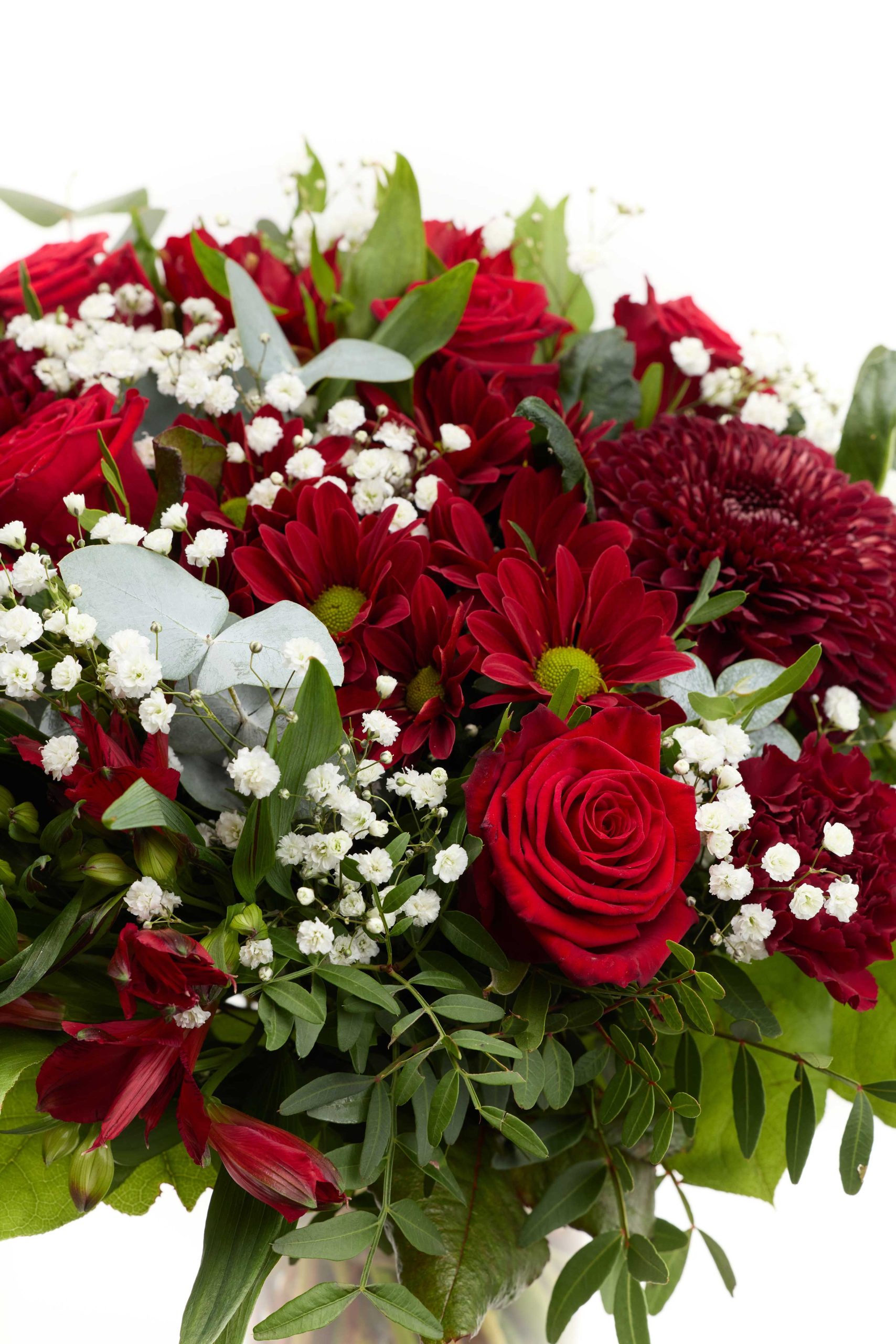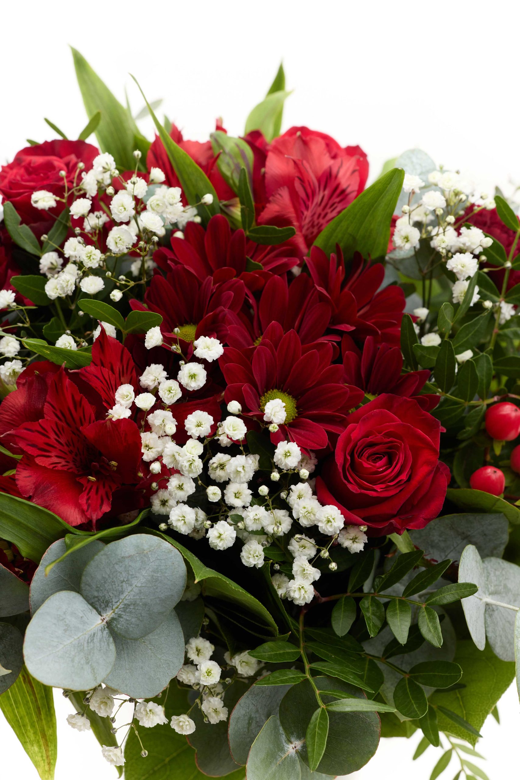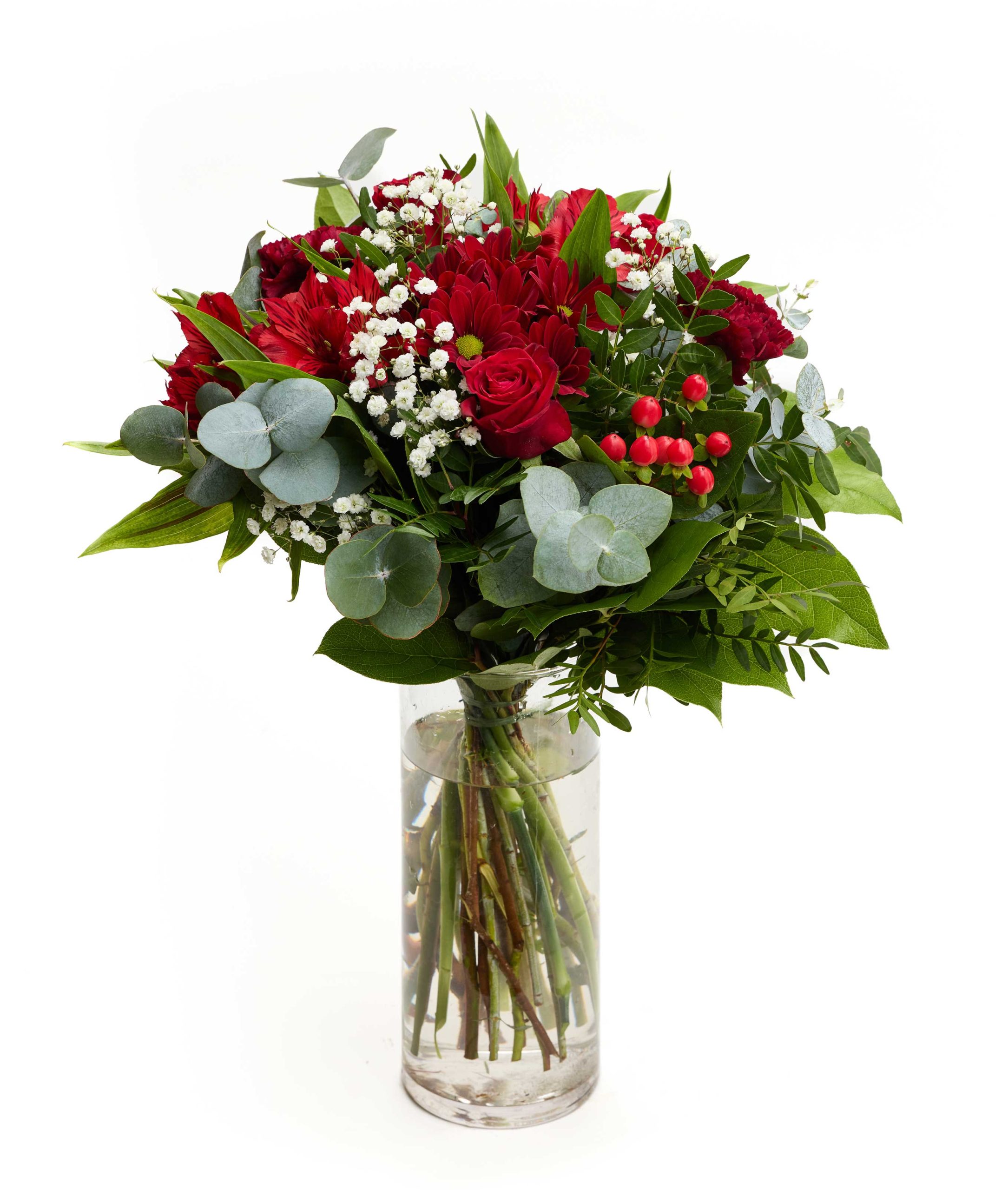 Eldfell er fallegur rauður vöndur með mismunandi tegundir af blómum. Þar má nefna rósir, nellikur, krysa, brúarslör og ýmislegt grænt með.