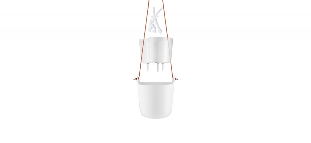 Hvítur upphengjanlegur pottur frá Eva Solo með sjálfvökvunarkerfi. Potturinn samanstendur af tveimur pottum, vatnsgeymslu og pott fyrir plöntuna.