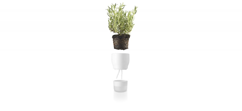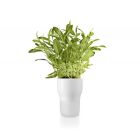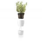 Hvítur pottur frá Eva Solo með sjálfvökvunarkerfi. Potturinn samanstendur af tveimur pottum, vatnsgeymslu og pott fyrir plöntuna.