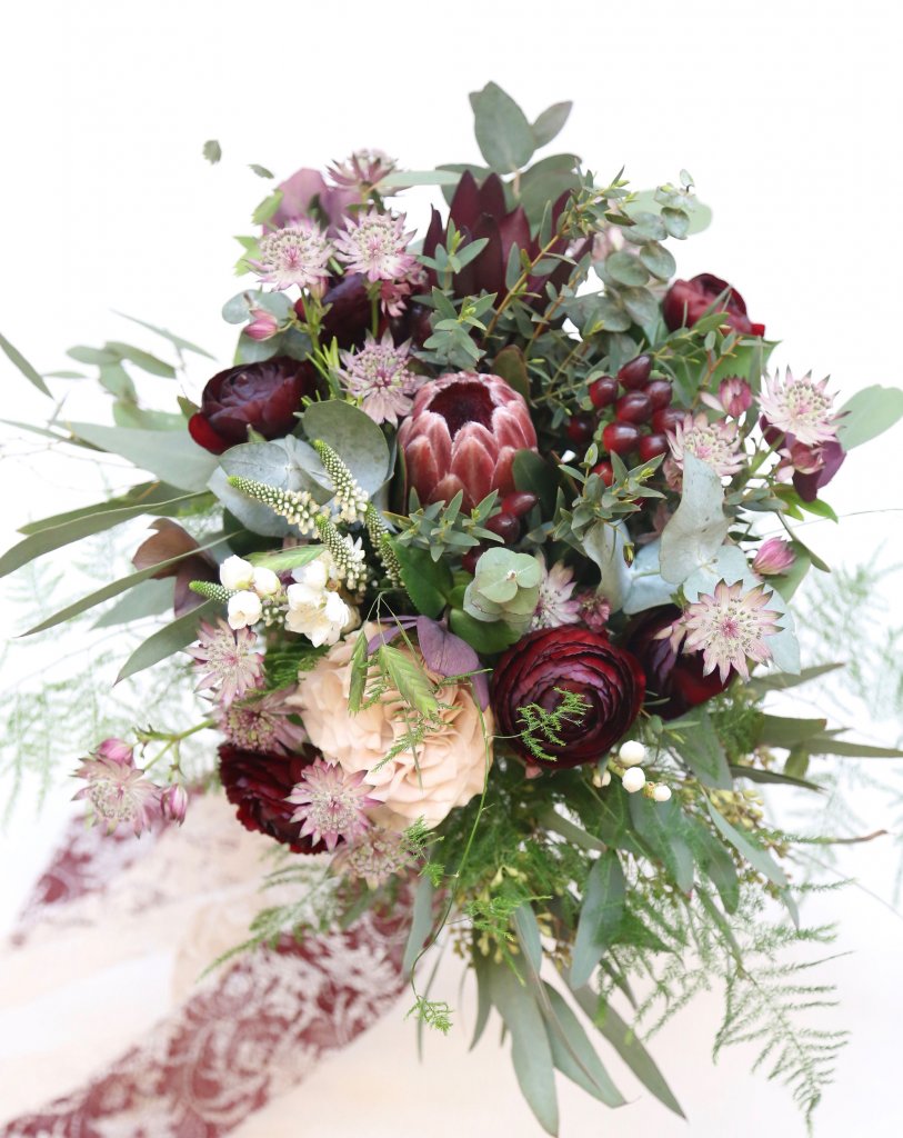 Framtíð er ákaflega fallegur vöndur sem samanstendur af ranaculus, proteu, astrantiu, veróniku, rós, hybericum berjum, locodendrum, eucalyptus og ýmsu grænu.