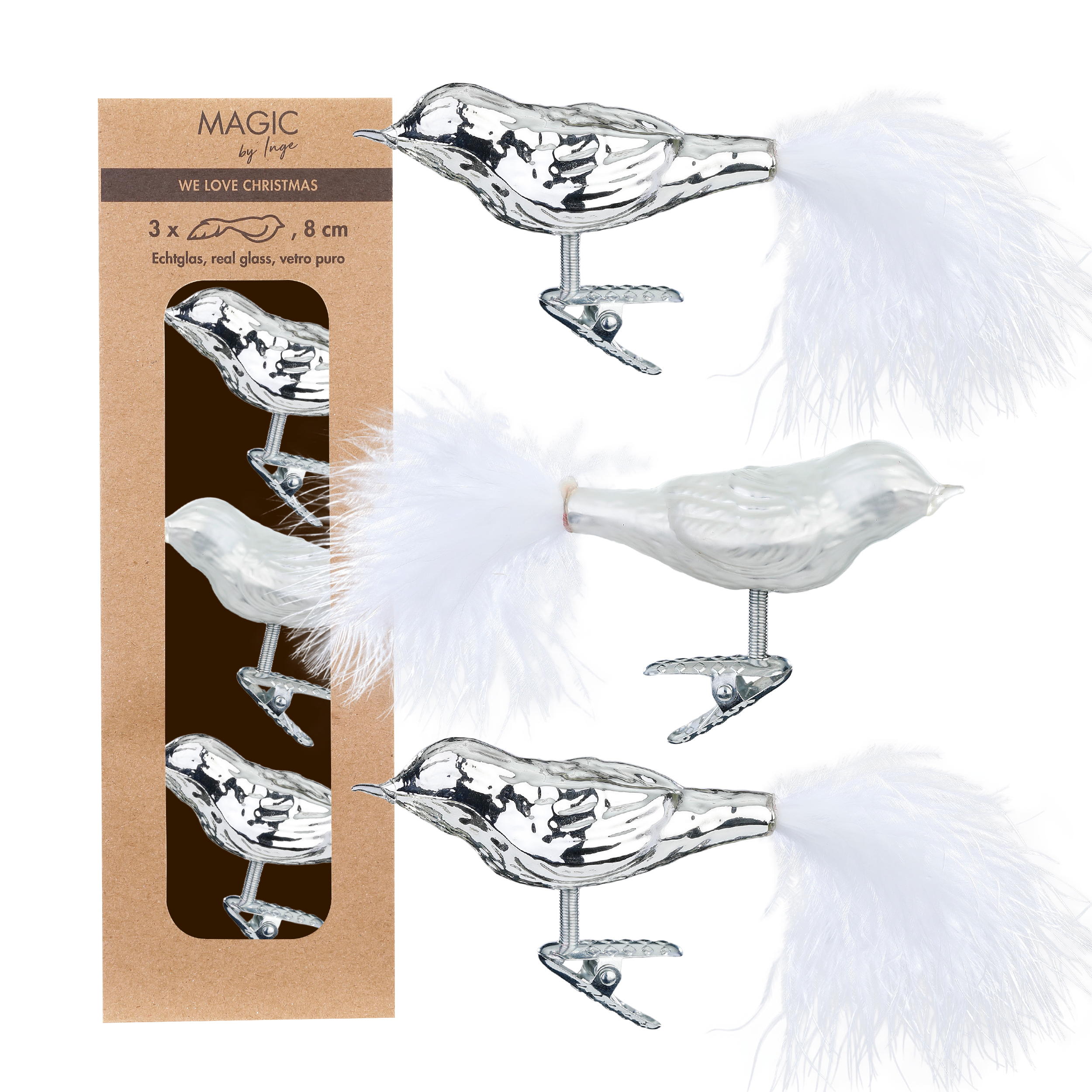 Fuglar á klemmu 3 stk, 8 cm – frost/silfur