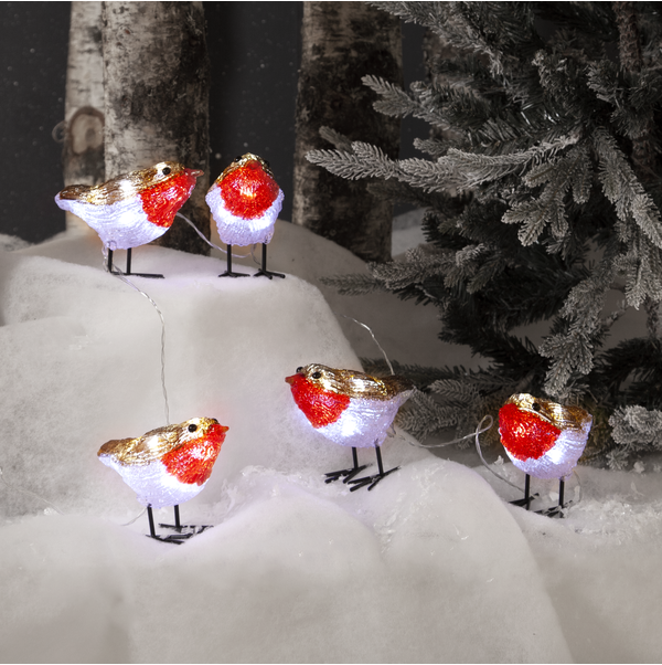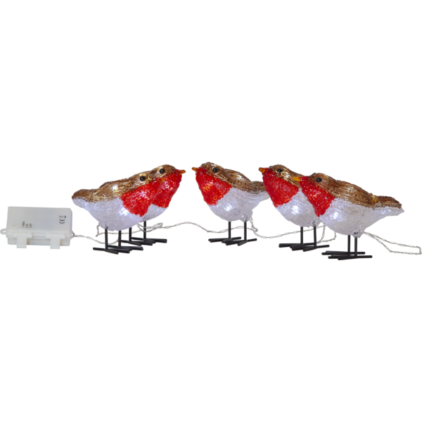 Skemmtileg fuglasería með 5 fuglum sem má nota bæði innan- og utandyra. Fuglarnir sjást vel í myrkri en hver fugl er með 8 hvít LED ljós. Serían gengur fyrir batteríum. Tímastillir er á seríunni sem gefur möguleika á að hafa kveikt í 8 klst og slökkt í 16 klst
