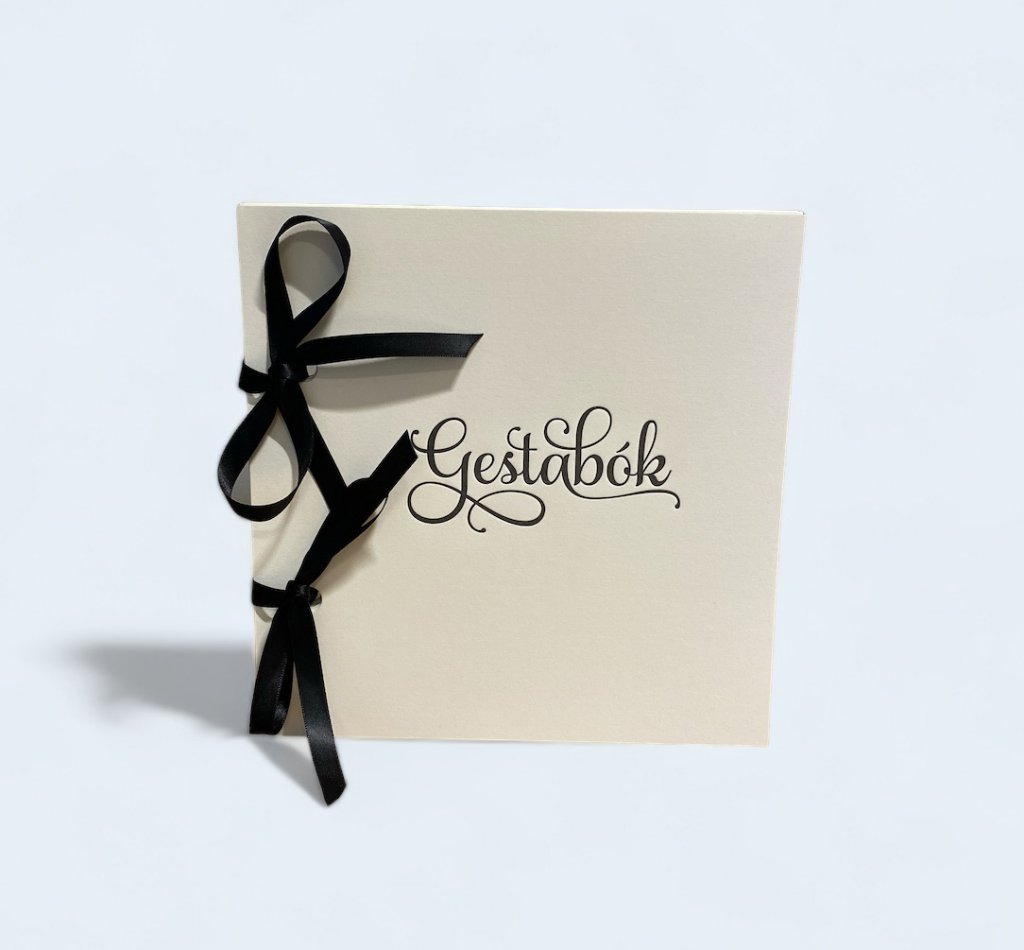 Gestabók með hvítri, harðspjalda, kápu sem er bundin saman með svörtum borða. Framan á kápunni er áletrað ,,Gestabók“ í svörtu letri.