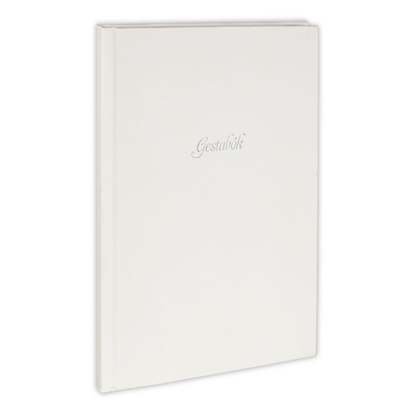 Gestabók með áletrun á harðri kápu, inniheldur 66 blaðsíður. Hvít kápa með „Gestabók“ í silfruðu letri.