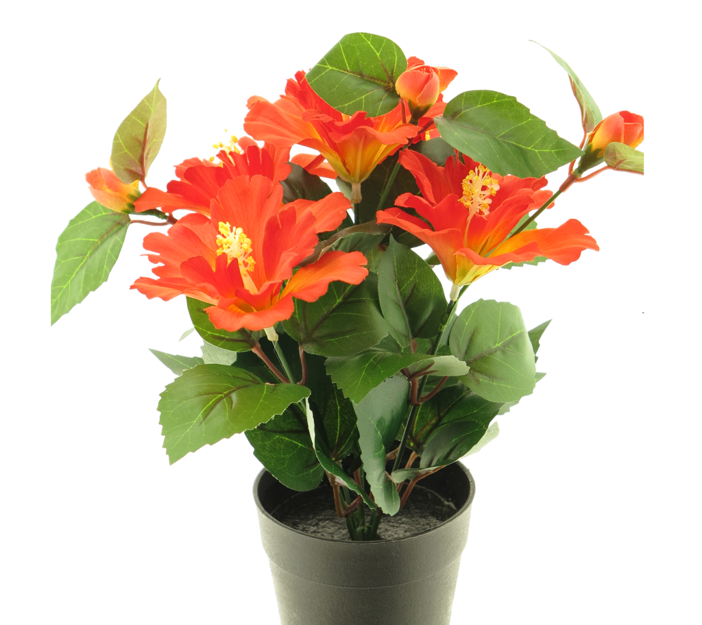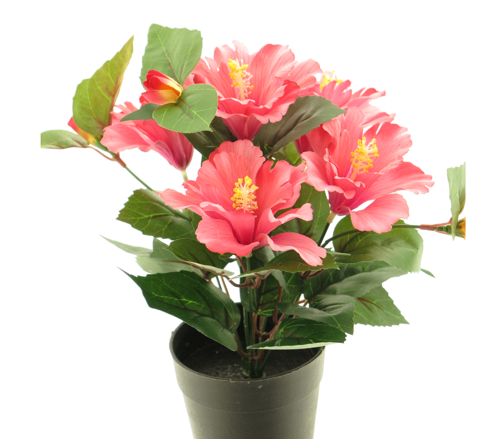 Hawaiirós í potti, fæst í appelsínugulu og bleiku.