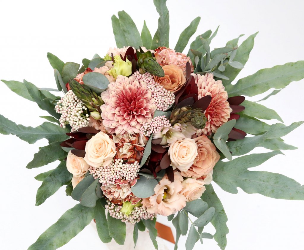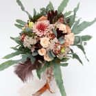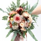 Heillandi vöndur sem samanstendur af rósum, silkivendi, achillea, krusa, brúðarkollu, nelliku, locodendrum og eucalyptus.