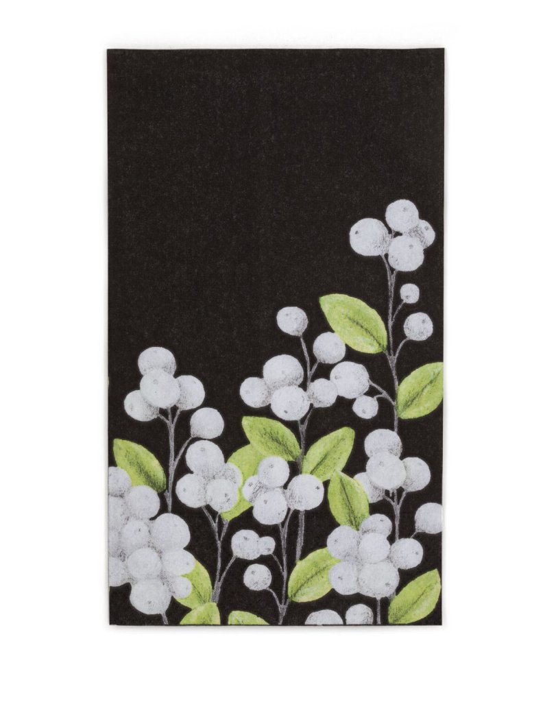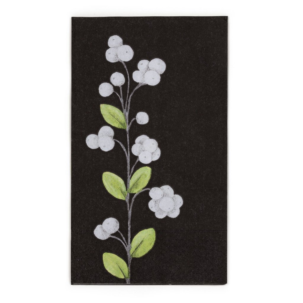 Ílangar jólasveinaservíettur í svörtum lit með snjóberjum frá Heklu Islandi. Mismunandi myndir á fram- og bakhlið.