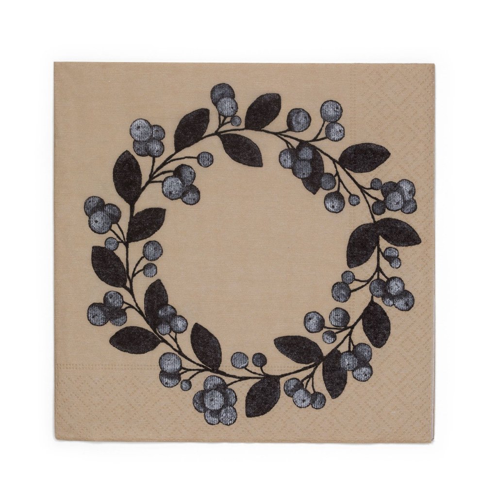 Jólasveinaservíettur í brúnum lit með snjóberjum frá Heklu Islandi. Mismunandi myndir á fram- og bakhlið.