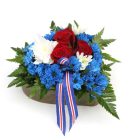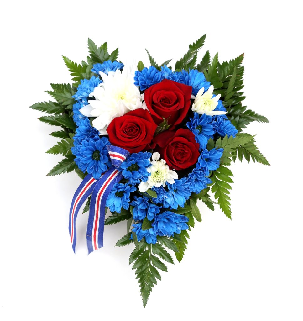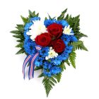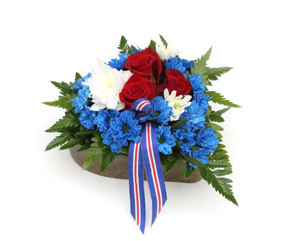 Skreyting í fánalitunum í hjartalaga skál. Skreytingin inniheldur krysa, rósir og blöndu af grænu.