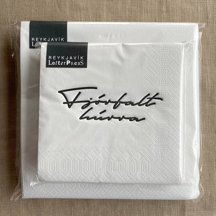 Hvítar servíettur frá Letterpress með skrautskrifað í svörtu ,,Fjórfalt húrra“ á hverja servíettu.