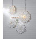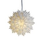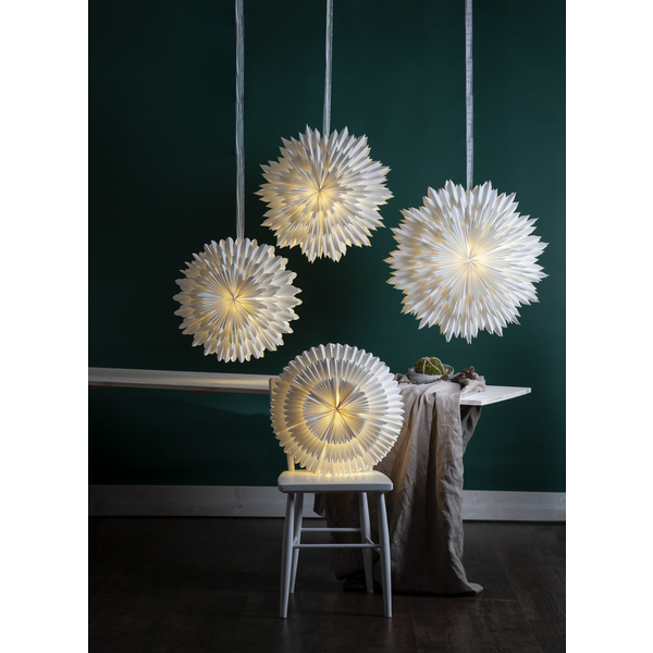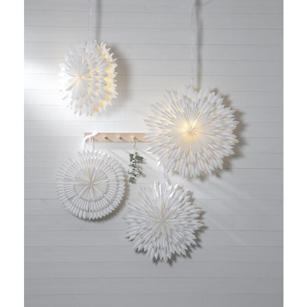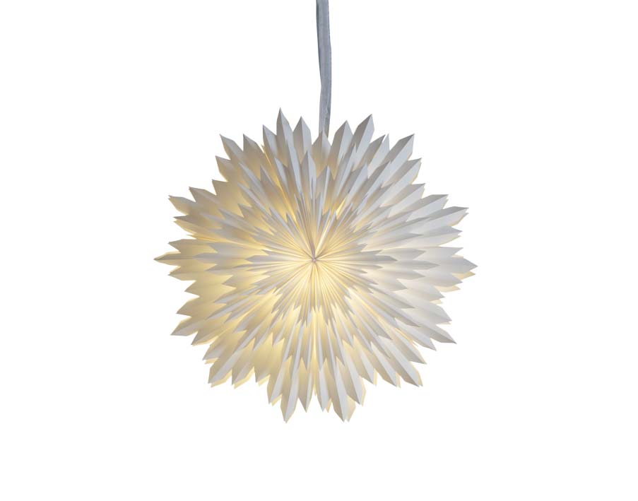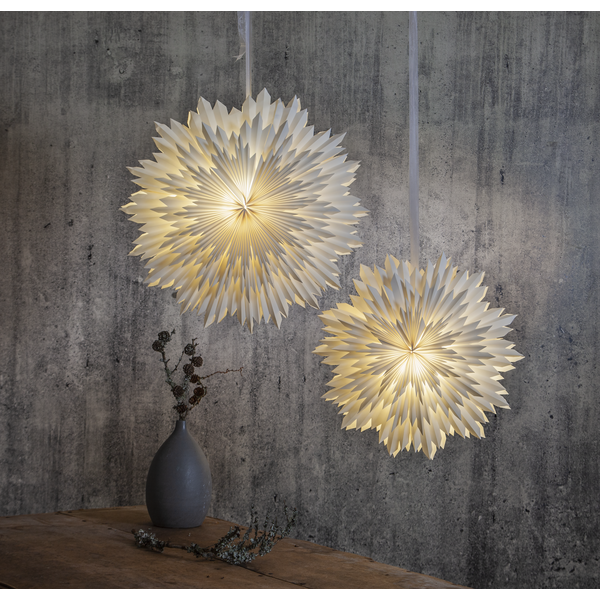 Dásamlega falleg hvít pappastjarna frá Star í þremur lögum af pappír. Útlínan er óregluleg með vetrarlegum blæ. Fallegur borði fylgir stjörnunni svo auðvelt sé að hengja hana upp. Passar bæði í glugga og vegg. Stjarnan er falleg bæði með og án lýsingu. Mikilvægt er að fylgja myndbandinu hér að neðan þegar stjarnan er sett saman.