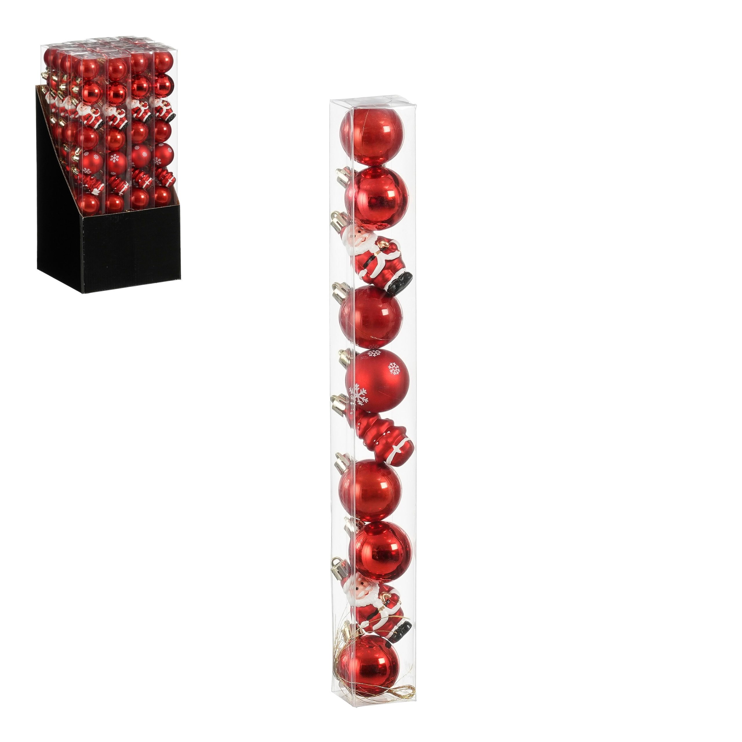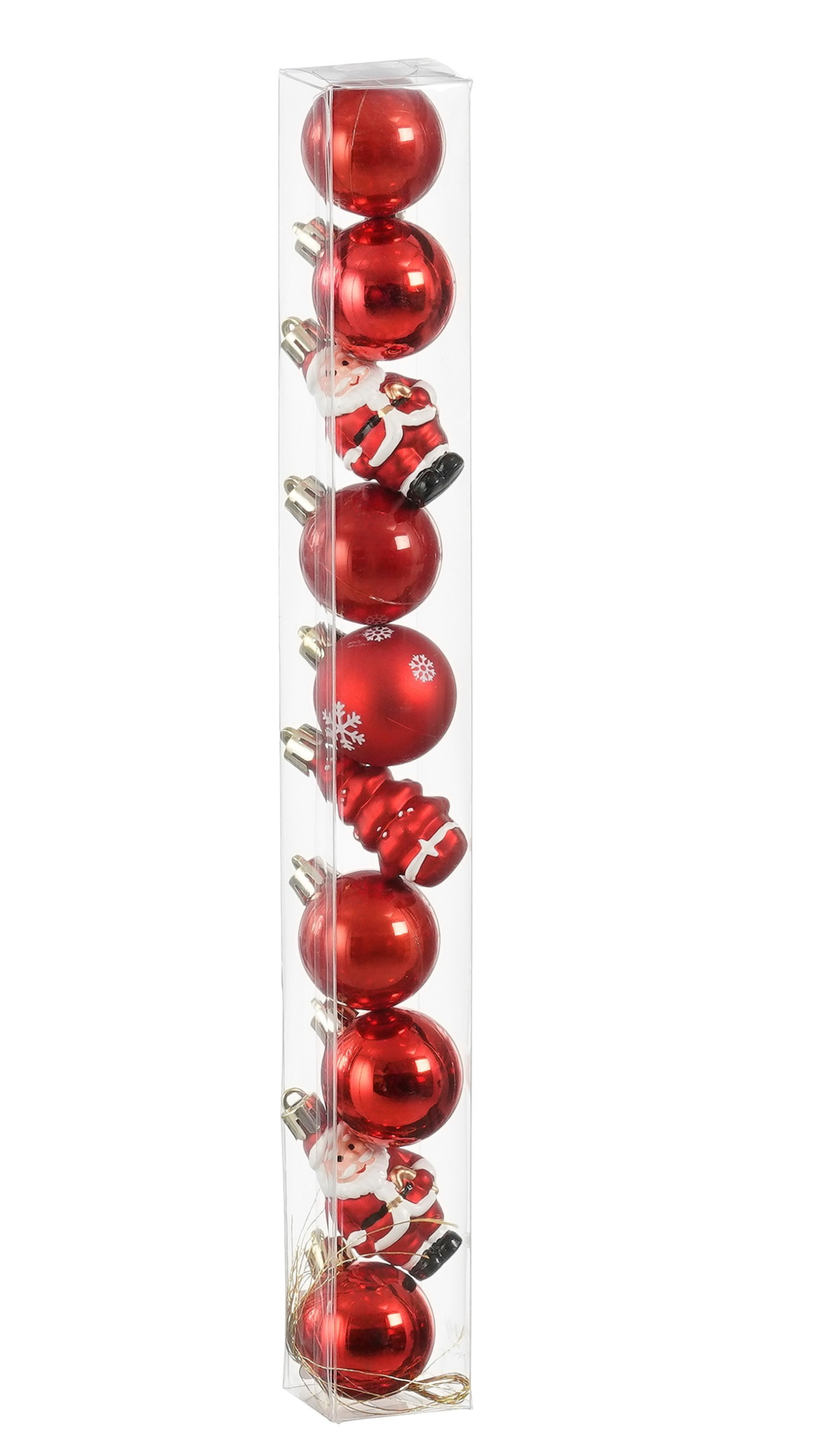 Rauðar jólakúlur, jólasveingar og eitt jólatré saman í pakka.