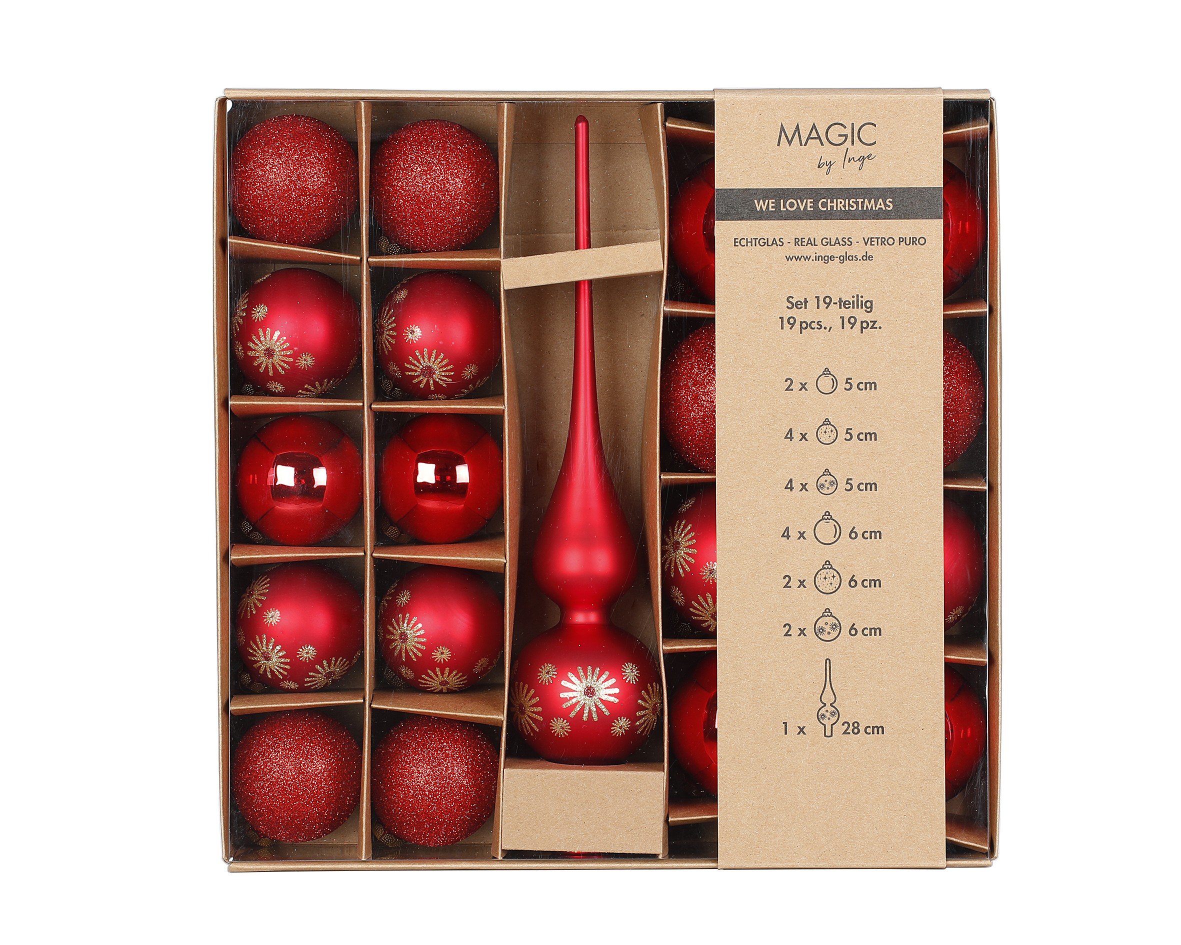 Jólakúlur og toppur, 19 stk í pakka – rautt