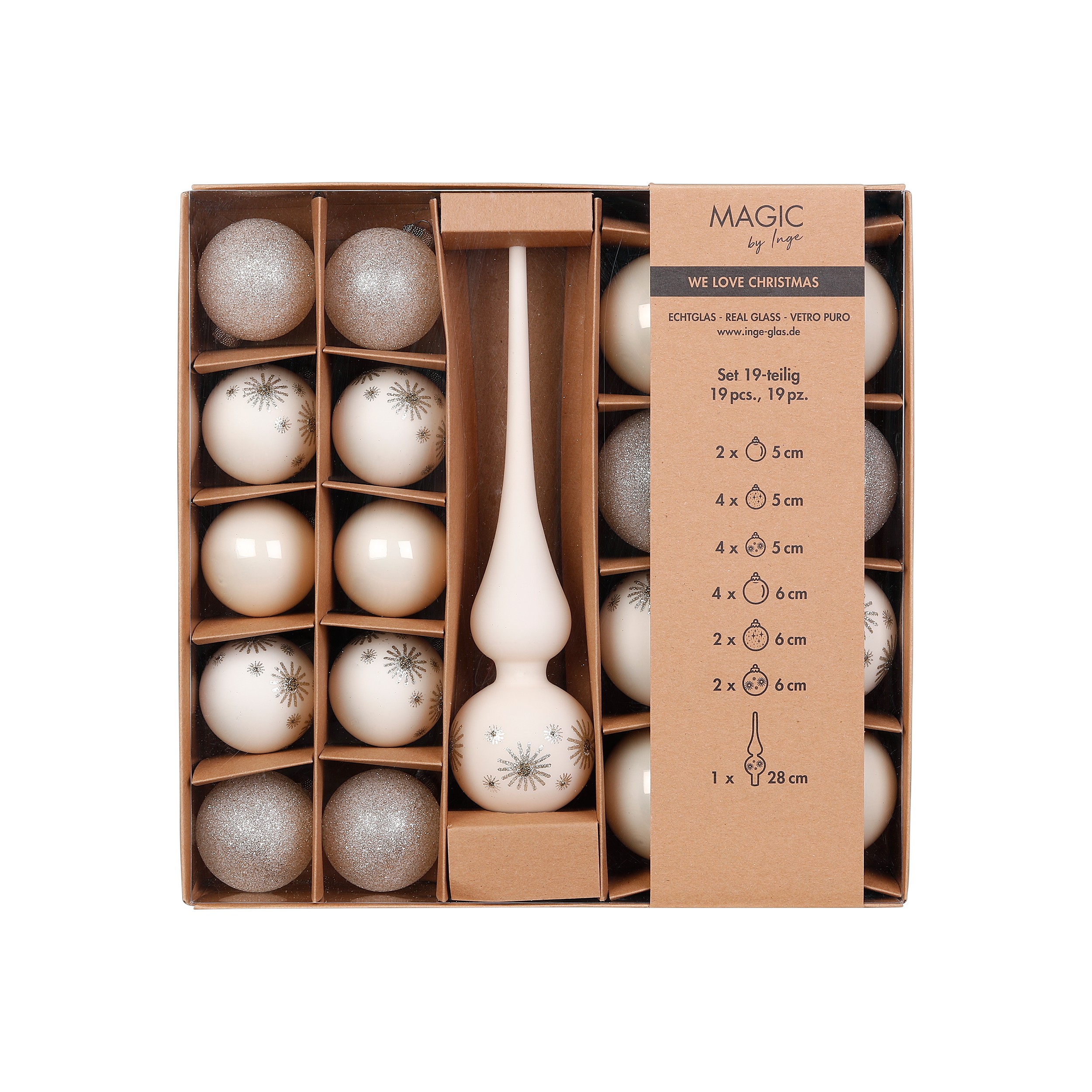 Jólakúlur og toppur saman í bakka, 19 stk – hvítt/silfur