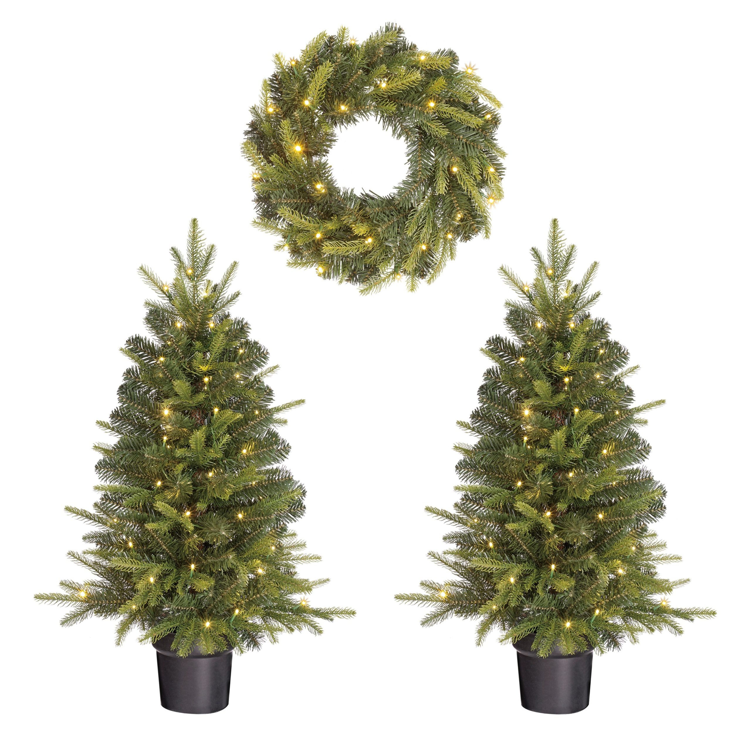 Krans og jólatré í potti. Á kransinum og trjánum er ljósasería