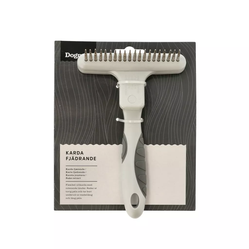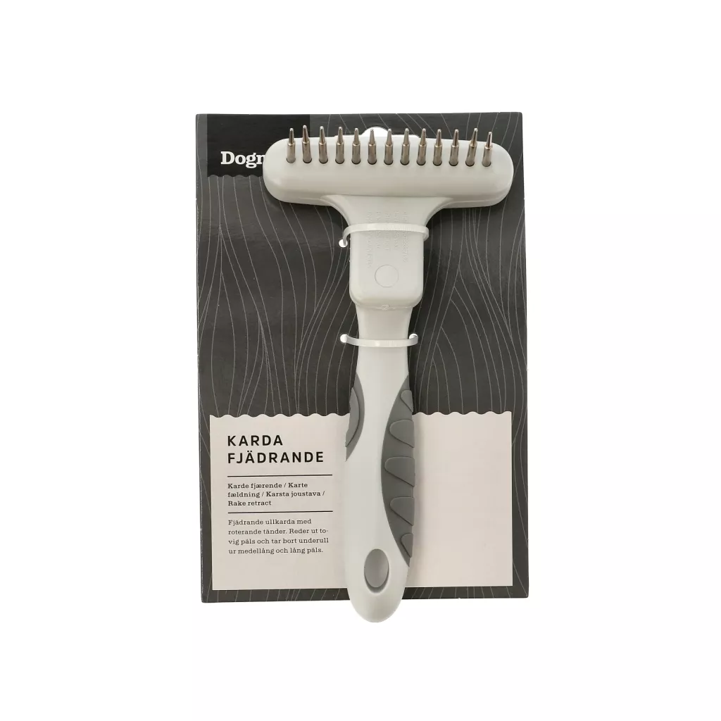 Fjaðrandi ullarkambur með snúningspinnum. Greiðir í gegnum flæktan feld og tekur undirfeldinn í burtu. Hentar fyrir meðalsíðan og síðan feld.