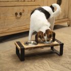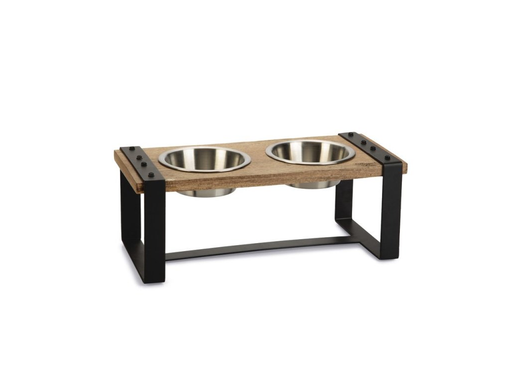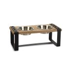 Standur með tveimur skálum. Standurinn er úr svörtum málmi og með fallega viðarplötu. Skálarnar eru úr ryðfríu stáli og má setja í uppþvottavél.