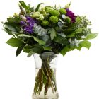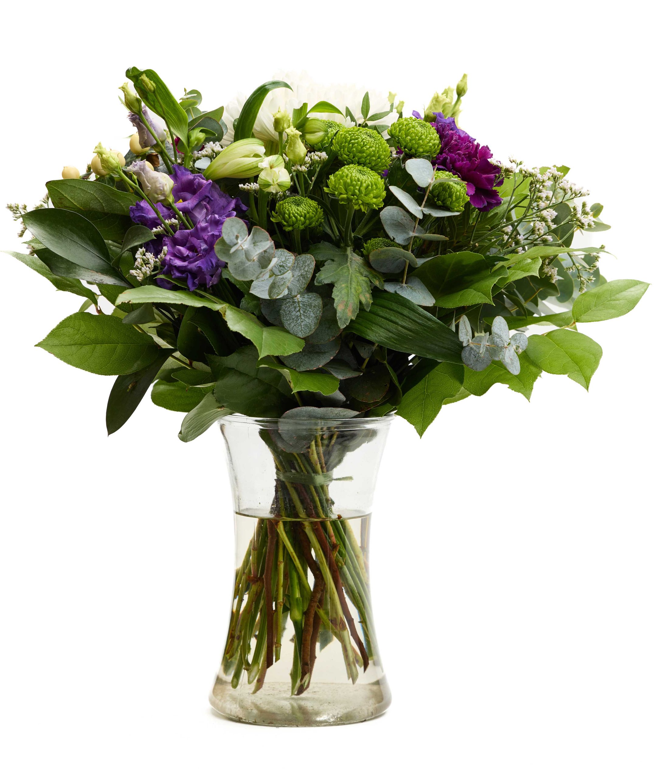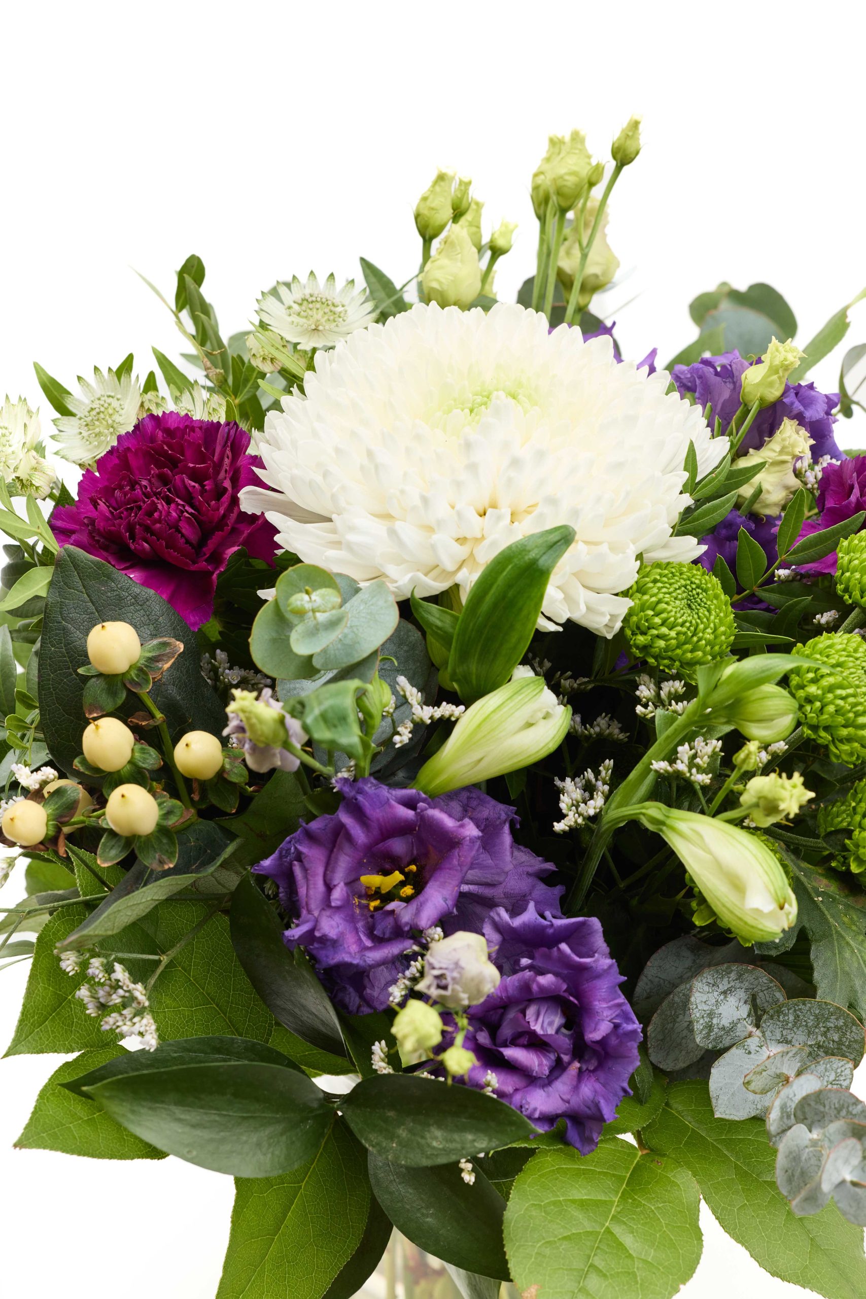 Líflegur og skemmtilegur blómvöndum í hvítum og fjólubláum tónum. Keilir samanstendur af krysa, silkivendi, nellikum, berjagreinum og blöndu af grænu.