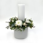 Falleg blómaskreyting í potti. Hægt er að velja um lit á aðalblómum í skreytingunni, einnig er hægt að velja hvort skreytingunni fylgir ljós eða dökkur pottur. Blómaskreytinging samanstendur af krysa, brúðarslöri, silkivendi og blöndu af grænu.