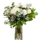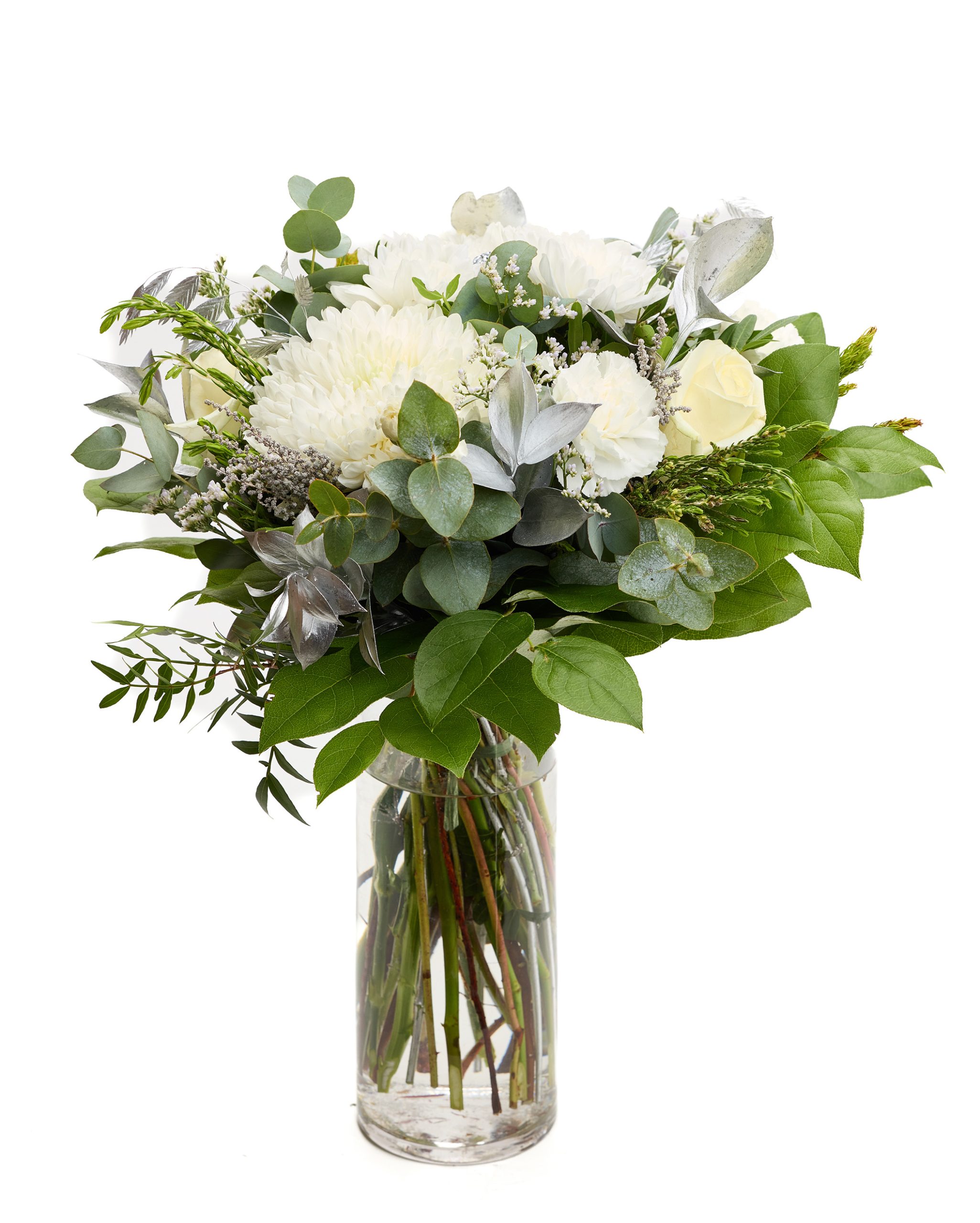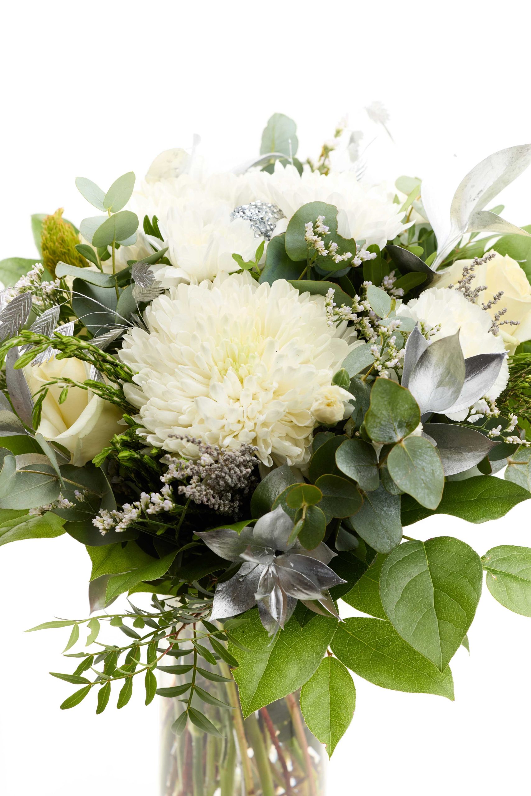 Klassískur hátíðarvöndur í hvítu sem samanstendur af rósum, krýsum, silfurlituðum greinum og blöndu af grænu.