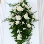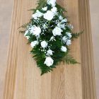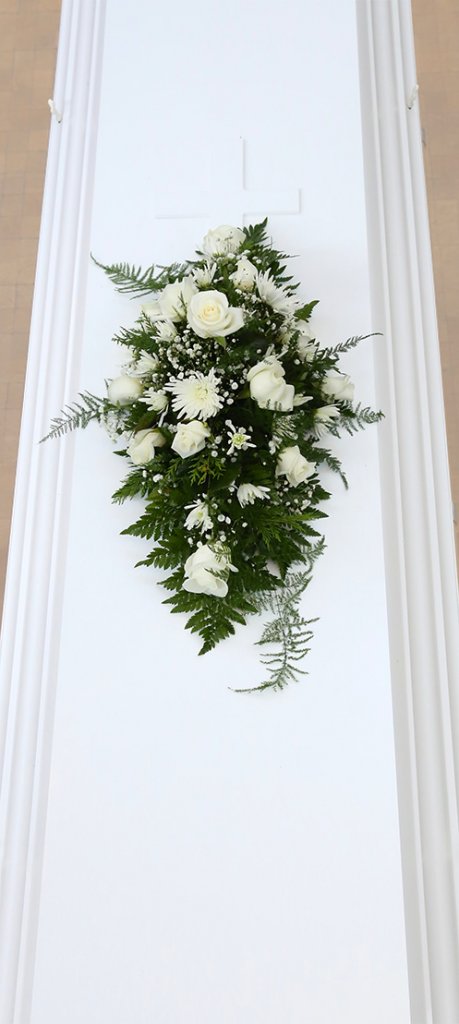 Lítil og látlaus kistuskreyting með hvítum rósum, krýsum og brúðarslöri ásamt blöndu af grænu.