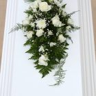 Lítil og látlaus kistuskreyting með hvítum rósum, krýsum og brúðarslöri ásamt blöndu af grænu.