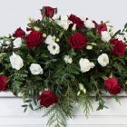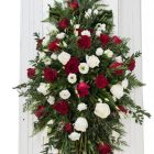 Falleg kistuskreyting í hvítu og rauðu sem inniheldur rósir, silkivönd og blöndu af grænu.