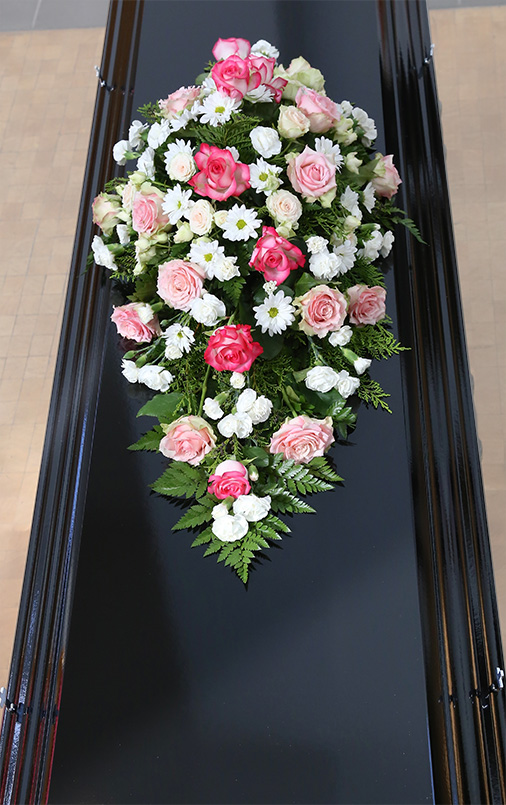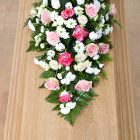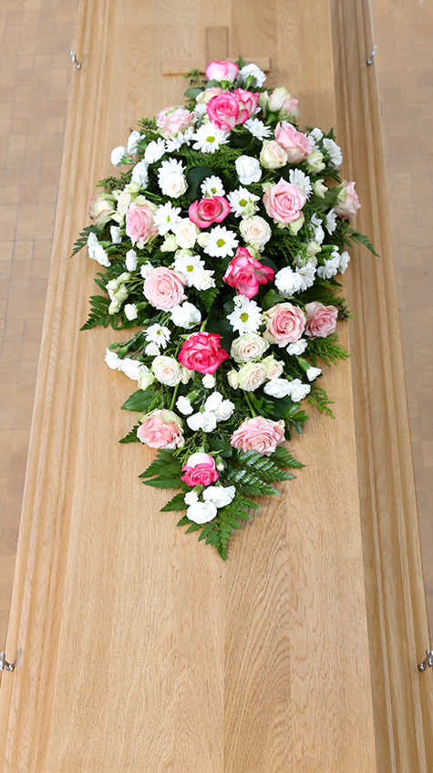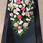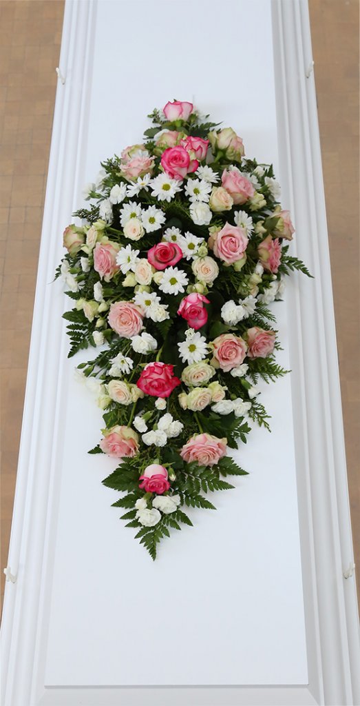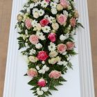 Glæsileg og þétt kistuskreyting í hvítu og bleiku sem inniheldur rósir, nellikur, krýsur og blöndu af grænu.
