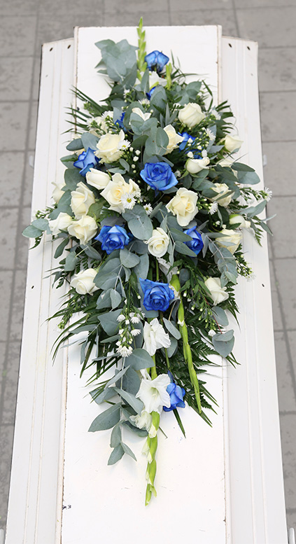 Glæsileg kistuskreyting í hvítu og bláu sem inniheldur gladíólur, rósir, krýsur, eucalyptus og blöndu af grænu.