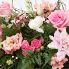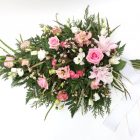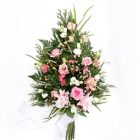 Ljúfur og fallegur kistuvöndur í bleiku sem inniheldur rósir, liljur, silkivönd, vaxblóm ásamt blöndu af grænu.