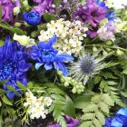 Yndislegur kistuvöndur bláleitum tónum. Sem inniheldur silkivönd, alpaþyrni, krysa ásamt blöndu af grænu.