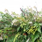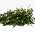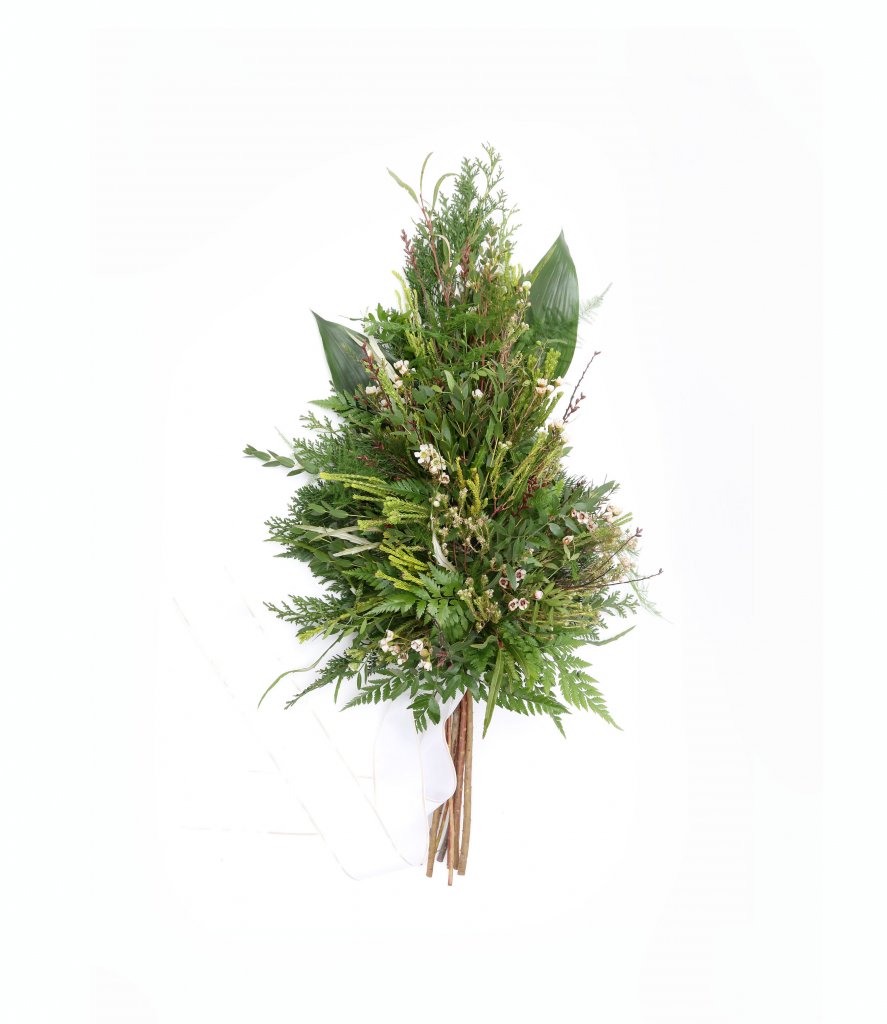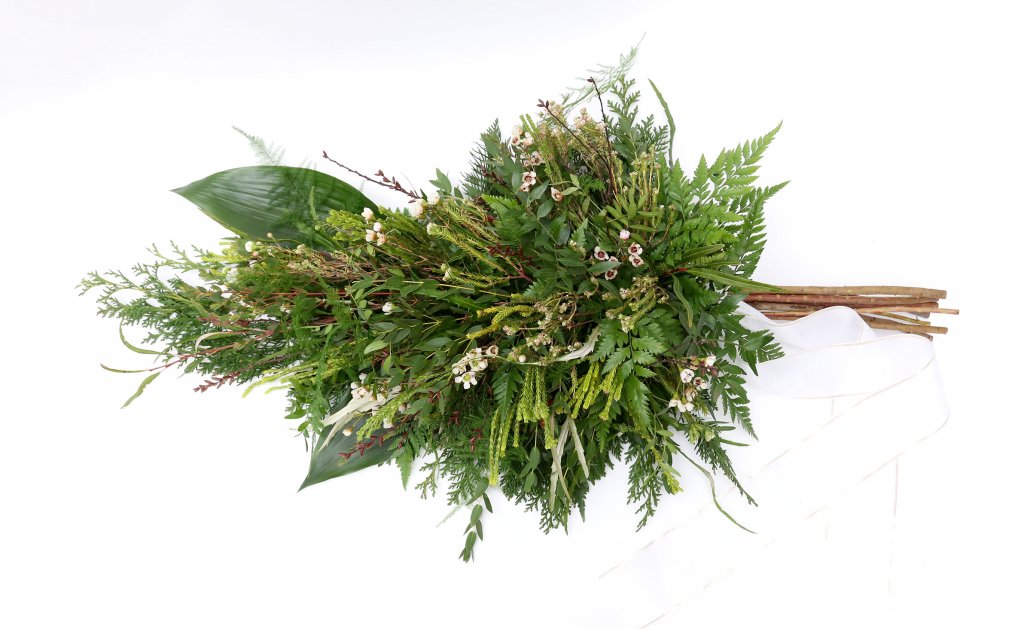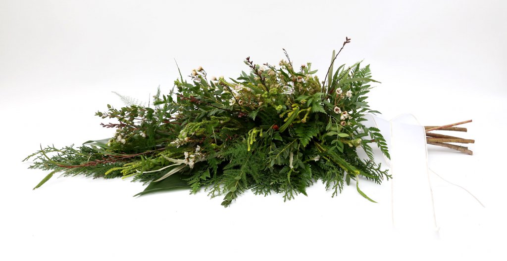 Látlaus og ljúfur kistuvöndur sem samanstendur af því fallegasta græna efni sem við eigum á hverjum tíma kryddað með ýmsu fallegu eins og gagel og vaxblómum.