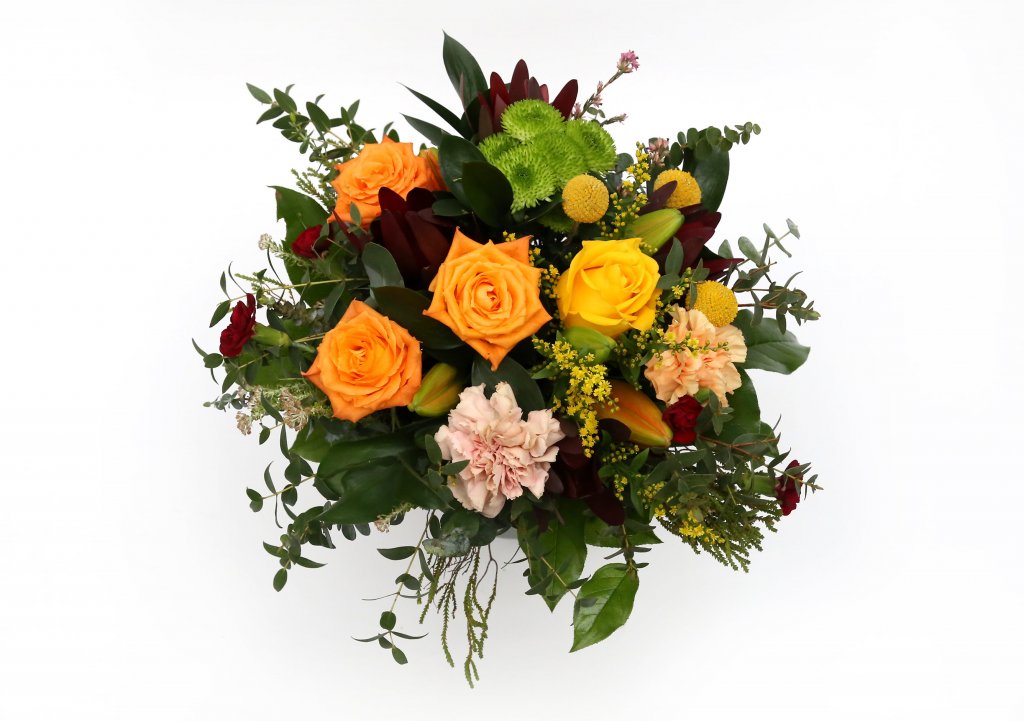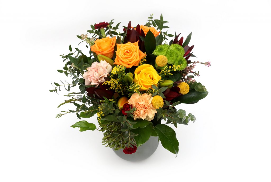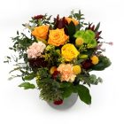 Krafla er kröftugur og bjartur vöndur sem samanstendur af rósum, krýsu, nellikum, eldlilju, staticu, leucodendrum, sólboltum og grænu.
