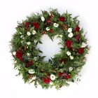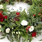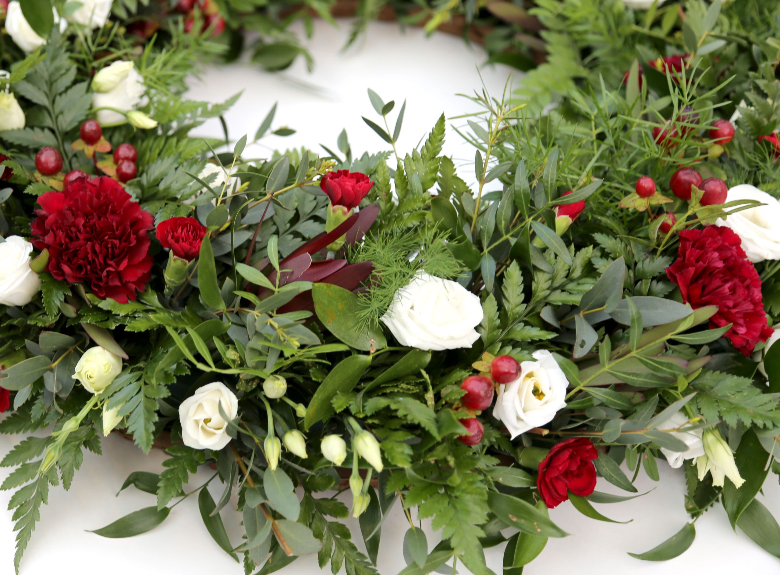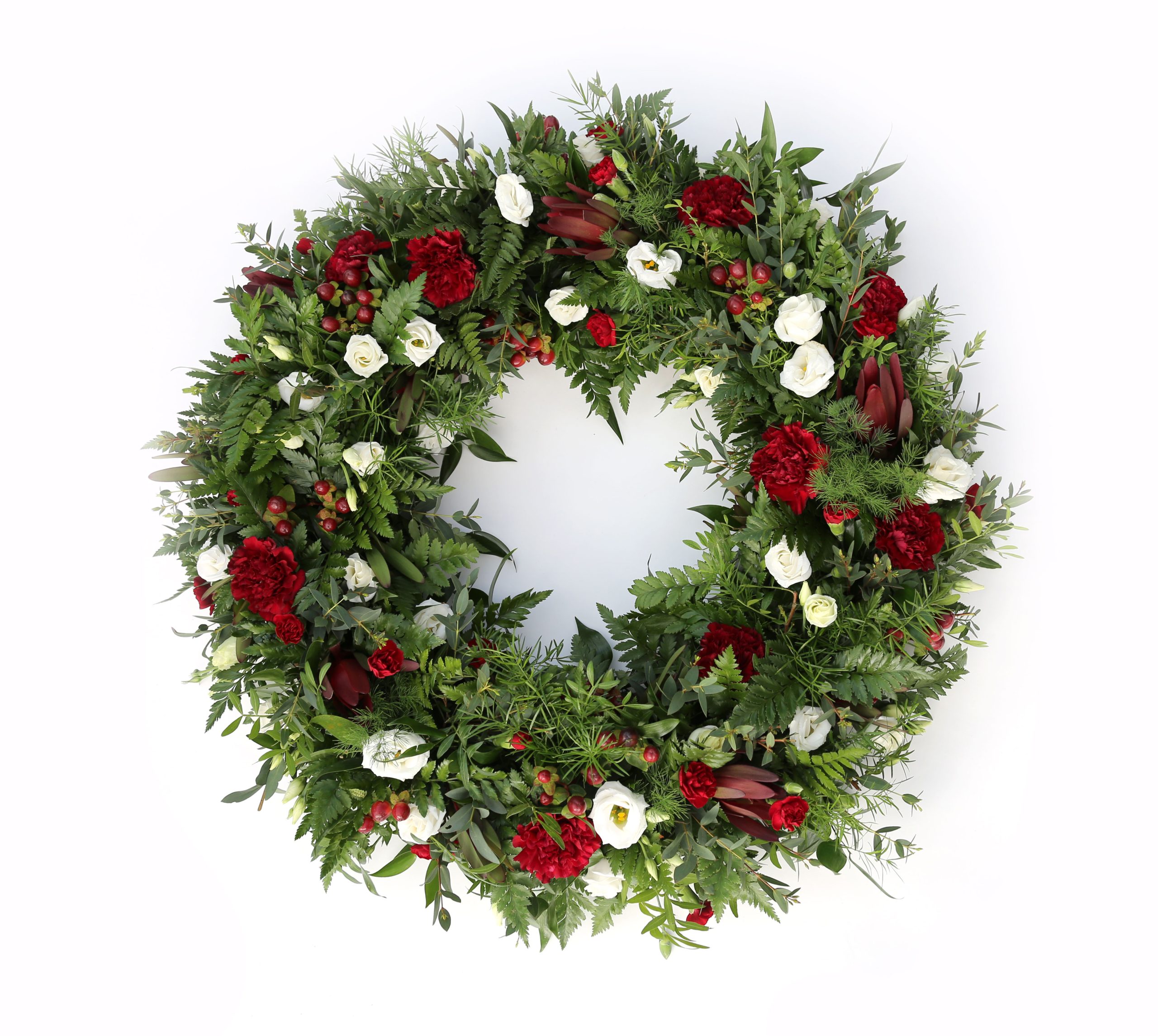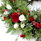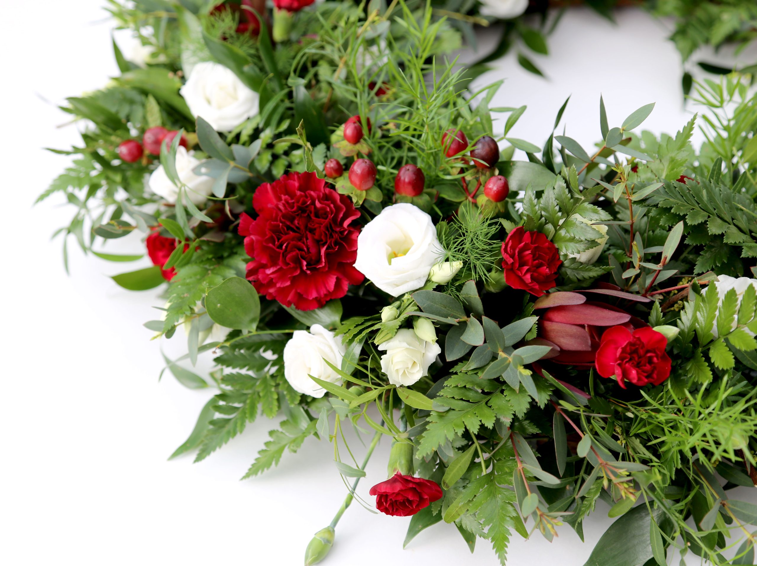 Heilskreyttur krans í rauðum og hvítum tónum. Kransinn inniheldur silkivönd, nellikur, locadendrum, berjagreinar og blöndu af grænu.