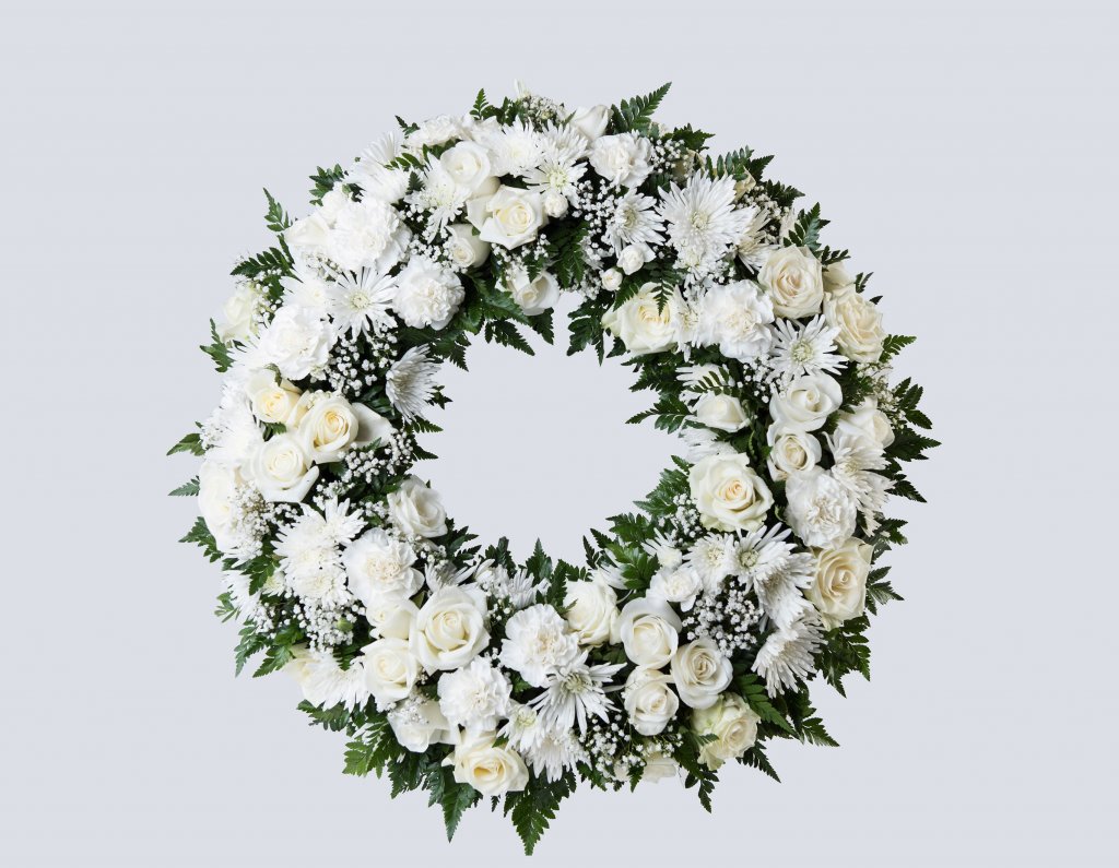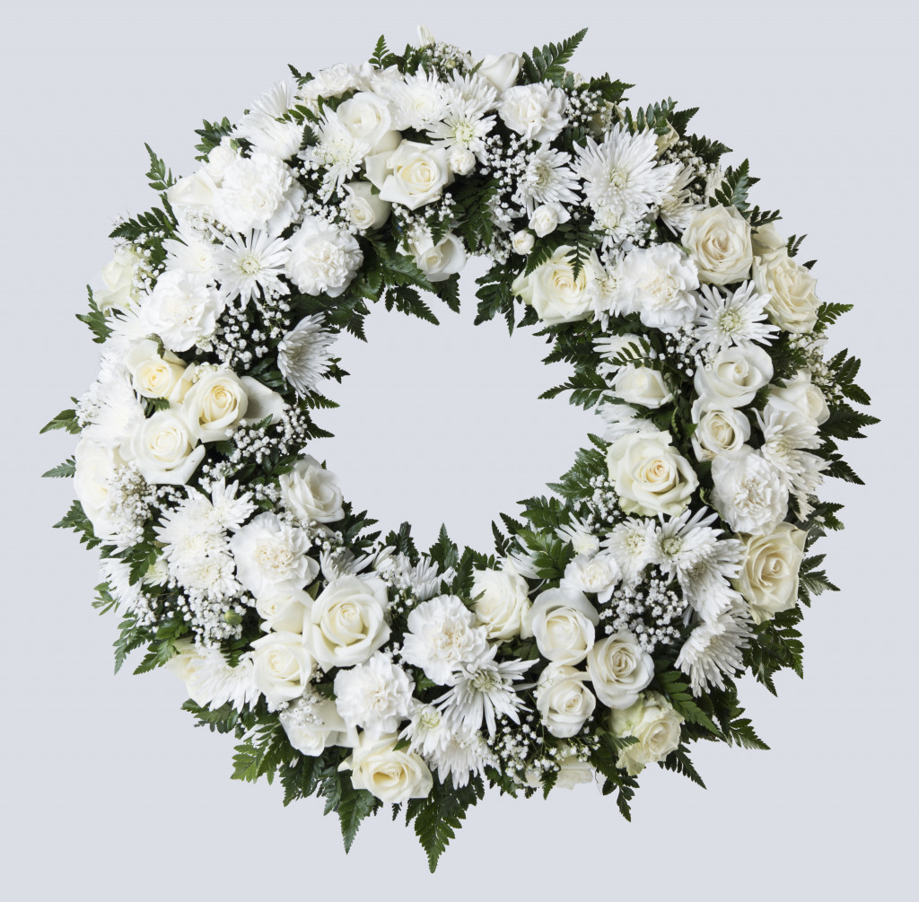 Þéttur og fallegur heilskreyttur krans í hvítu.
